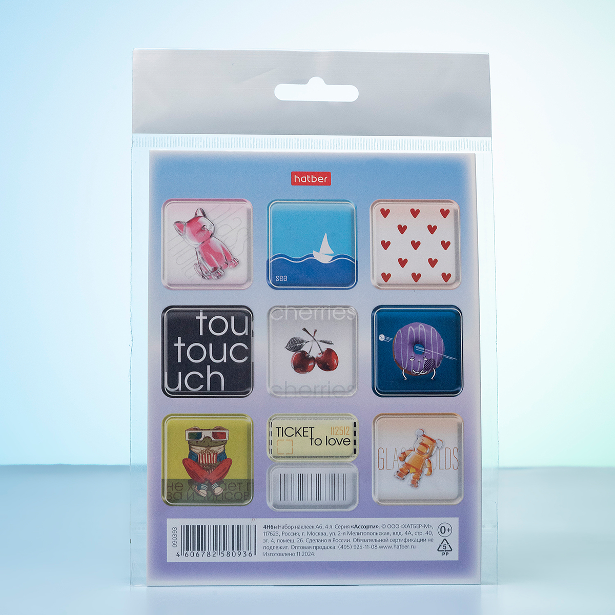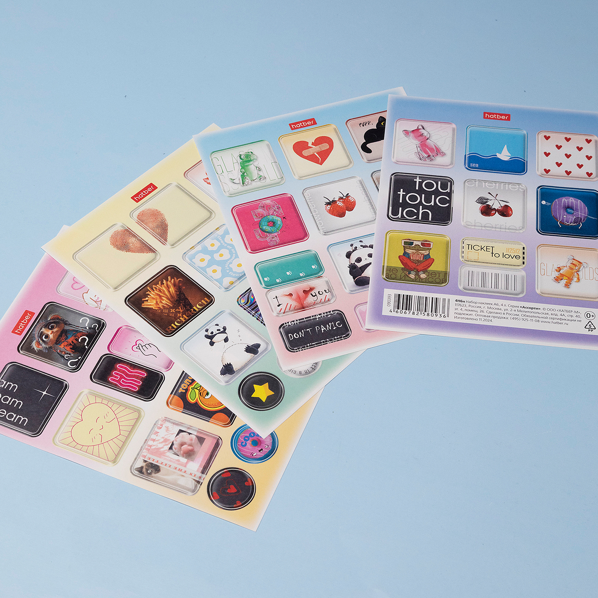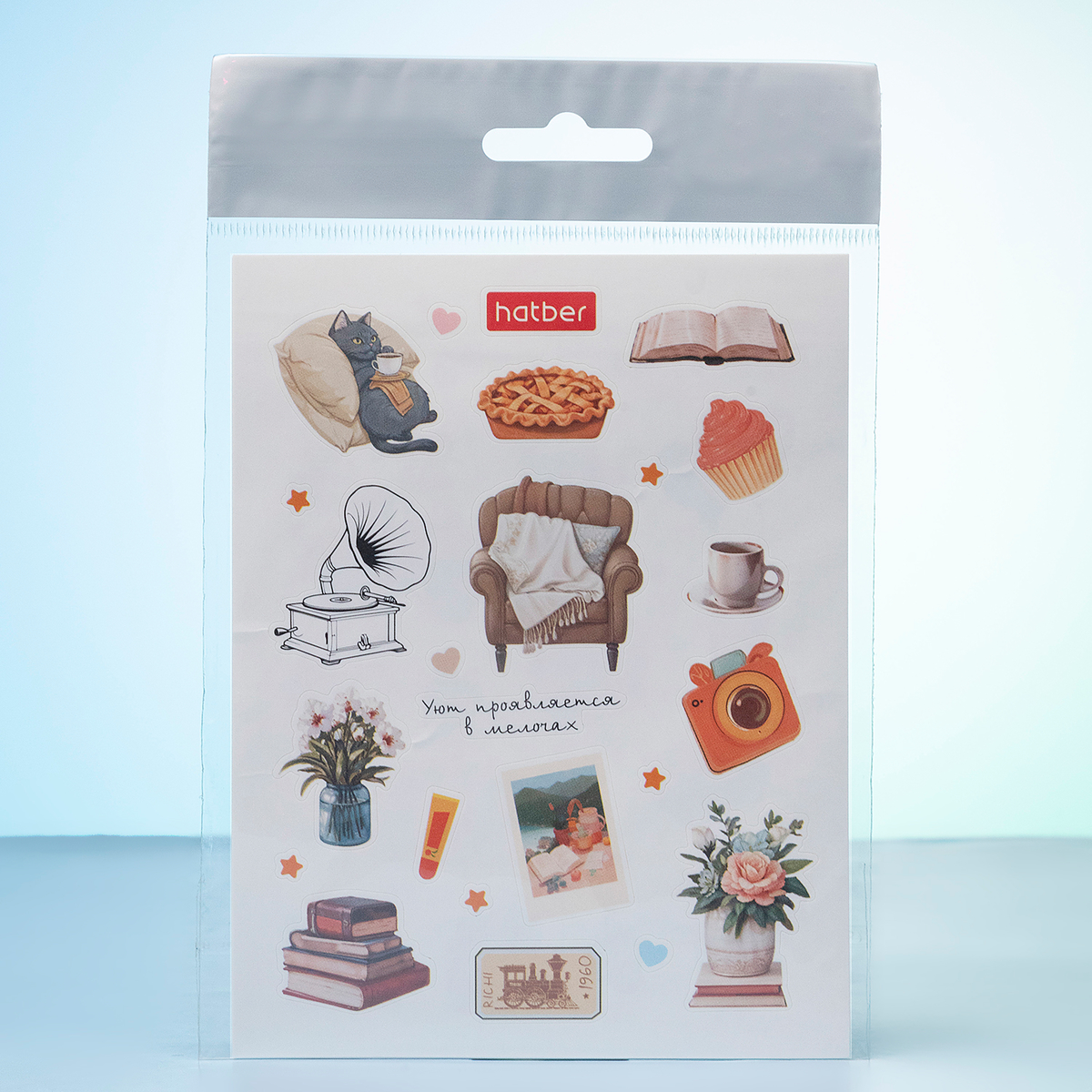 Наборы наклеек формата А6 (по 4 листа в наборе) от Hatber — отличное решение для такой творческой задачи. Милые, смешные, уютные и трогательные наклейки изготовлены на бумажной основе и помогут украсить что угодно: открытку, подарочную упаковку, записи, тетради, блокноты и т. д.