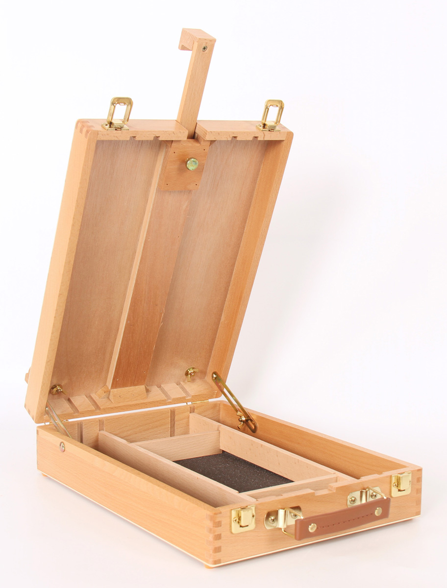 Такой этюдник с отделениями для художественных материалов имеет регулируемый по высоте верхний фиксатор, а также полку-упор для холстов и планшетов. В просторном внутреннем ящике можно хранить кисти, краски и другие необходимые принадлежности.