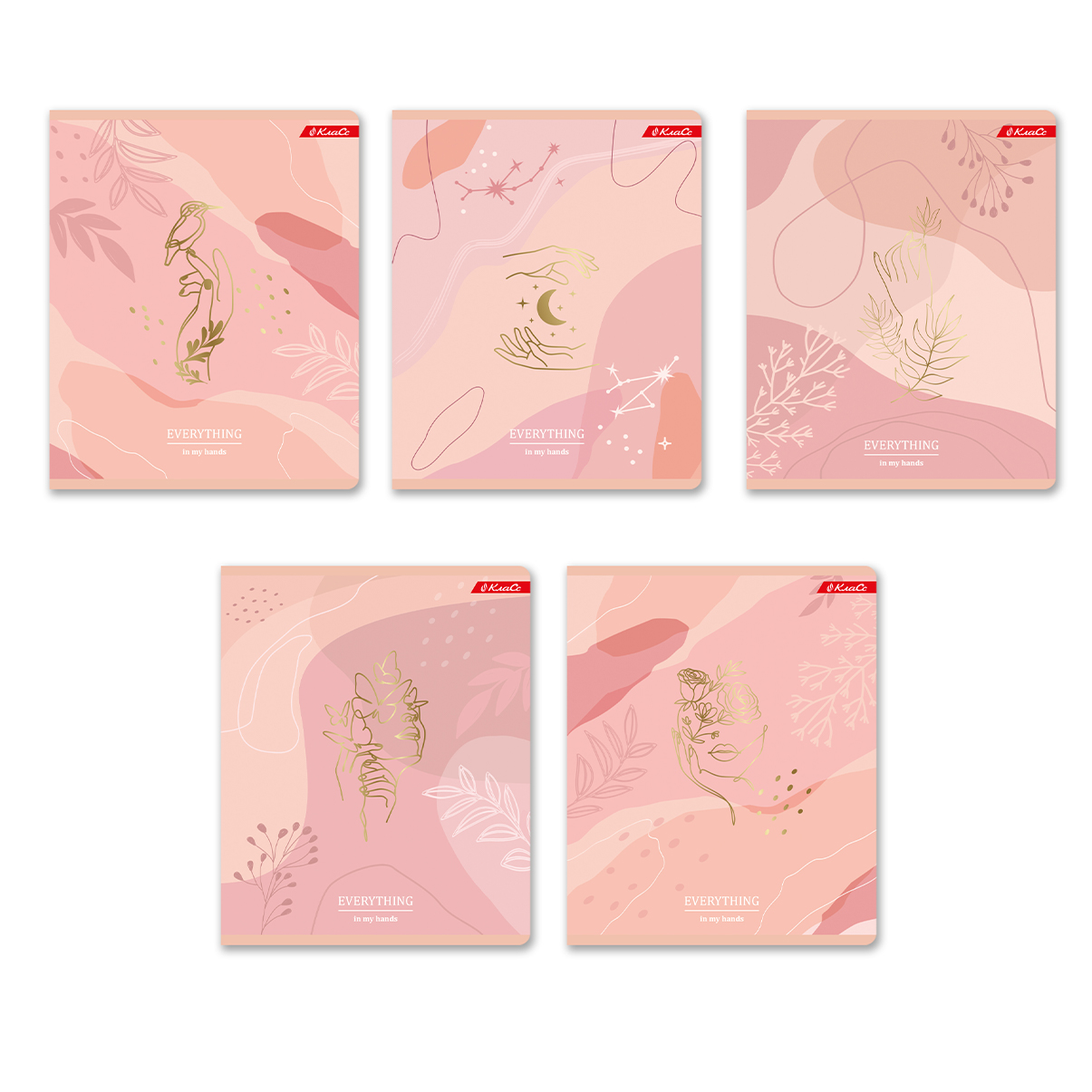 Общие тетради «Романтика» раскрывают чувство, которое трудно выразить словами, зато можно легко изобразить в розовой палитре. Тиснение фольгой играет на свету и придает особую атмосферность обложкам.