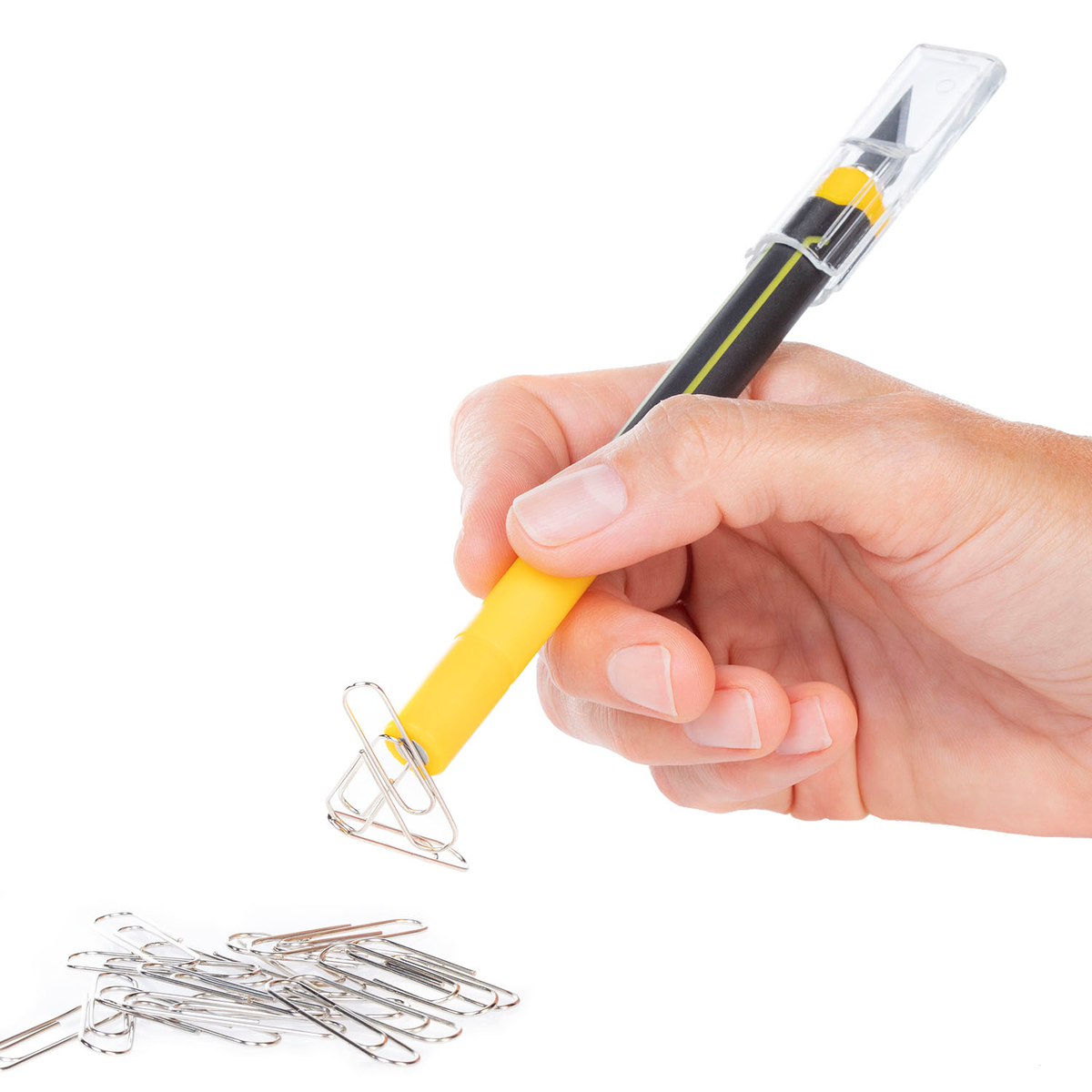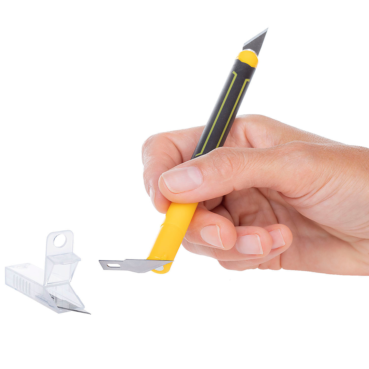 В комплекте два лезвия в пластиковом дисплее и защитный колпачок, предохраняющий от случайных порезов, а также в торце рукоятки установлен магнит, позволяющий извлечь сменное лезвие легко и без риска порезаться. Противоскользящее покрытие в зоне хвата обеспечивает комфорт при выполнении высокоточных работ.