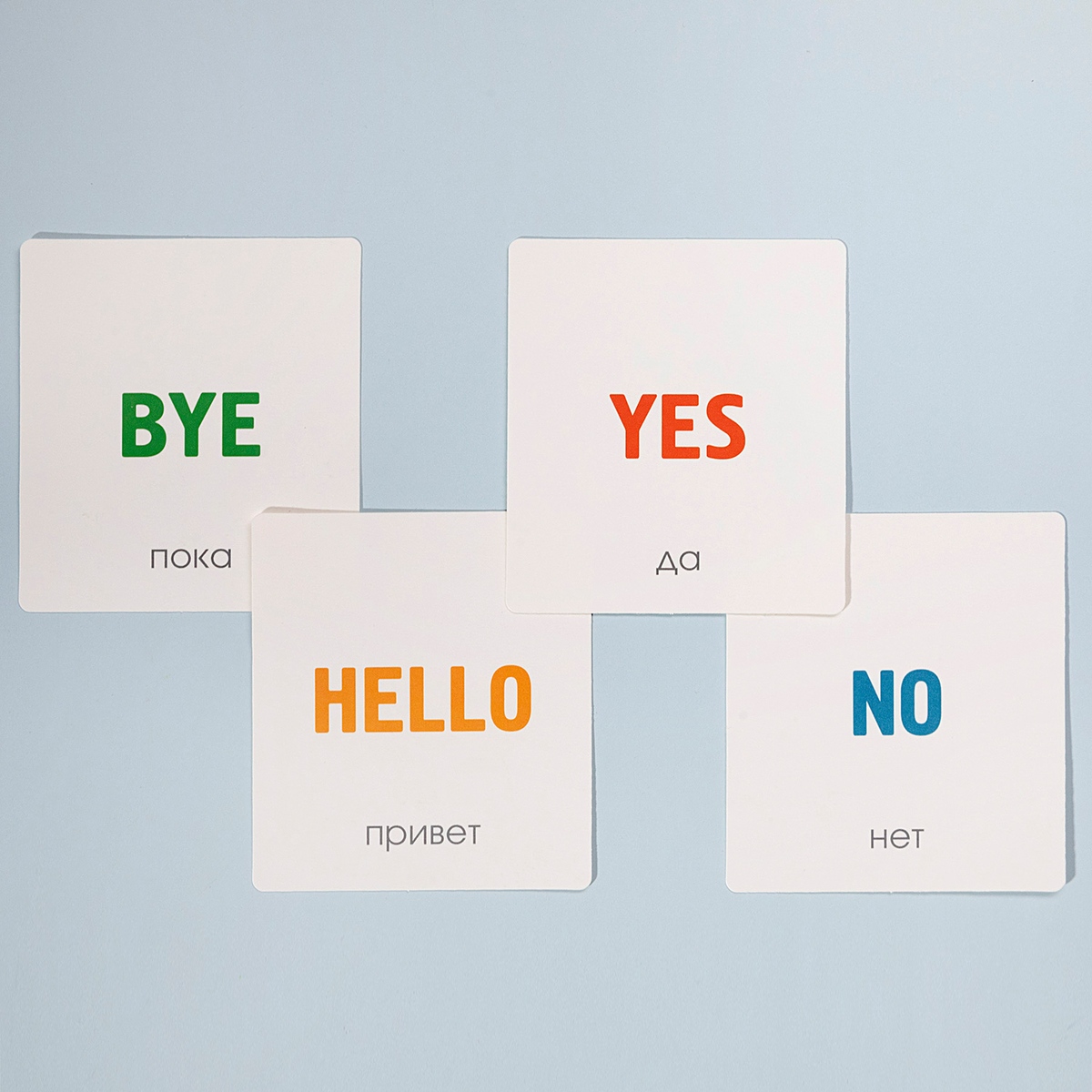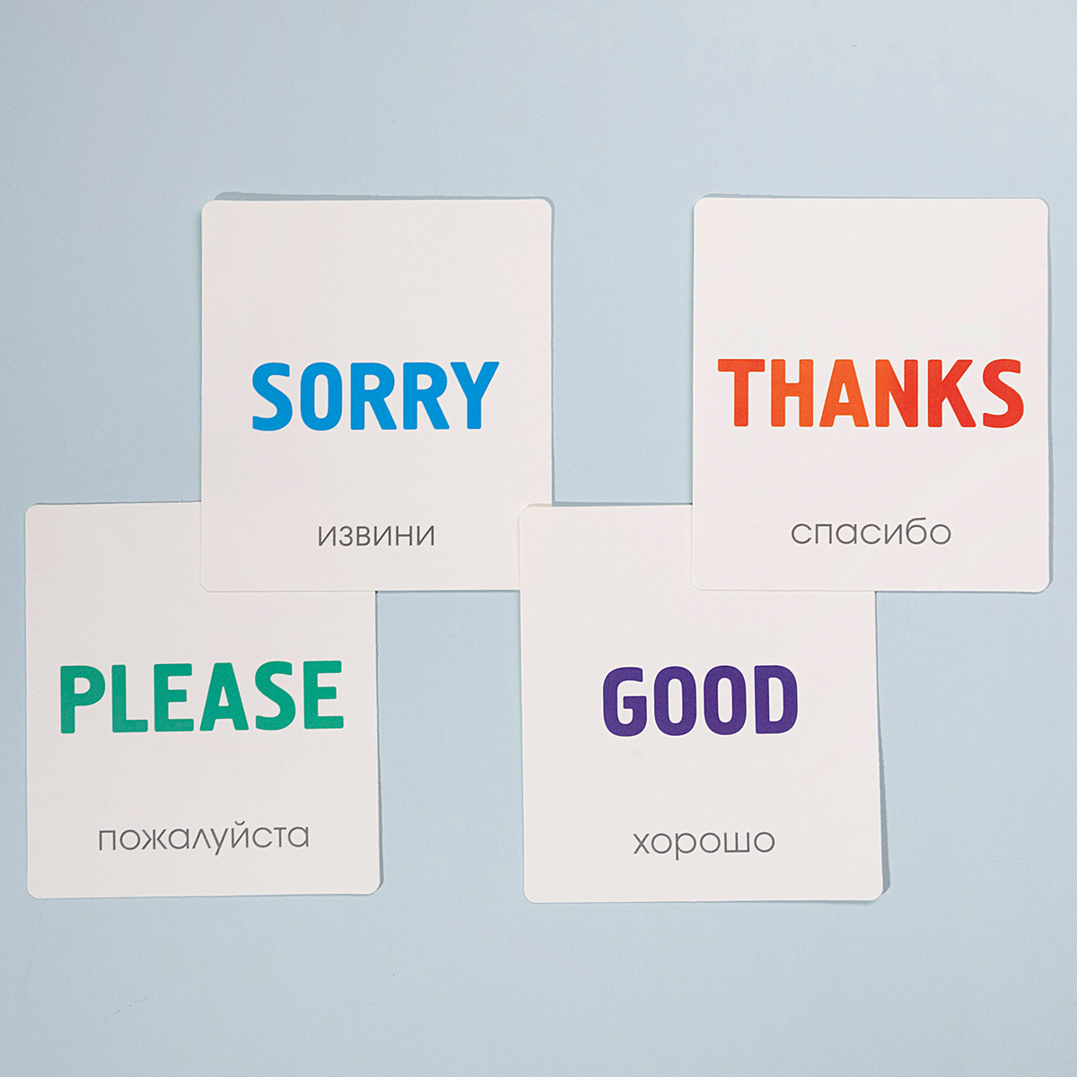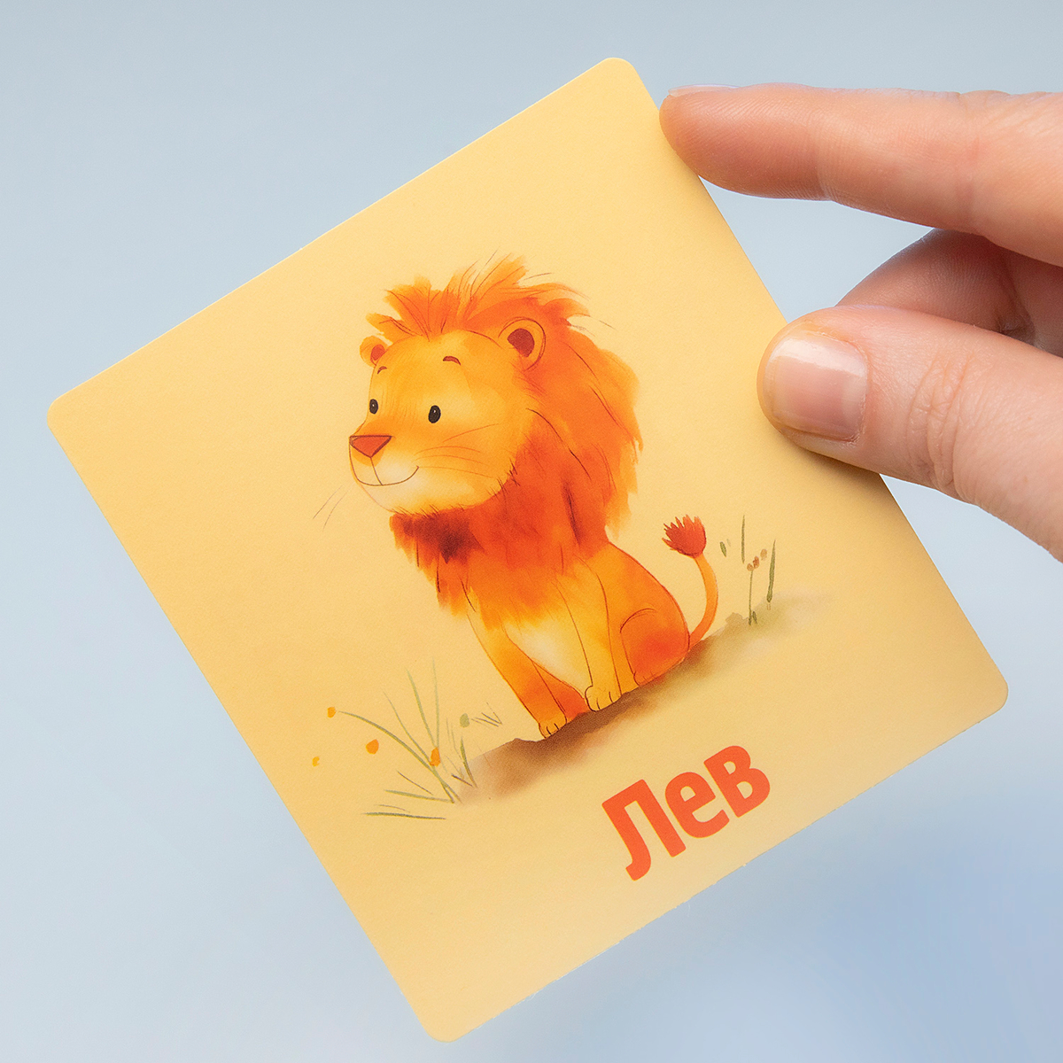 Карточки изготовлены из мелованного картона с покрытием софт тач — приятные на ощупь, устойчивые к износу. Скругленные углы обеспечивают безопасность даже для самых маленьких детей. Компактная глянцевая коробка для хранения — яркая и прочная, позволяет брать набор с собой в дорогу.