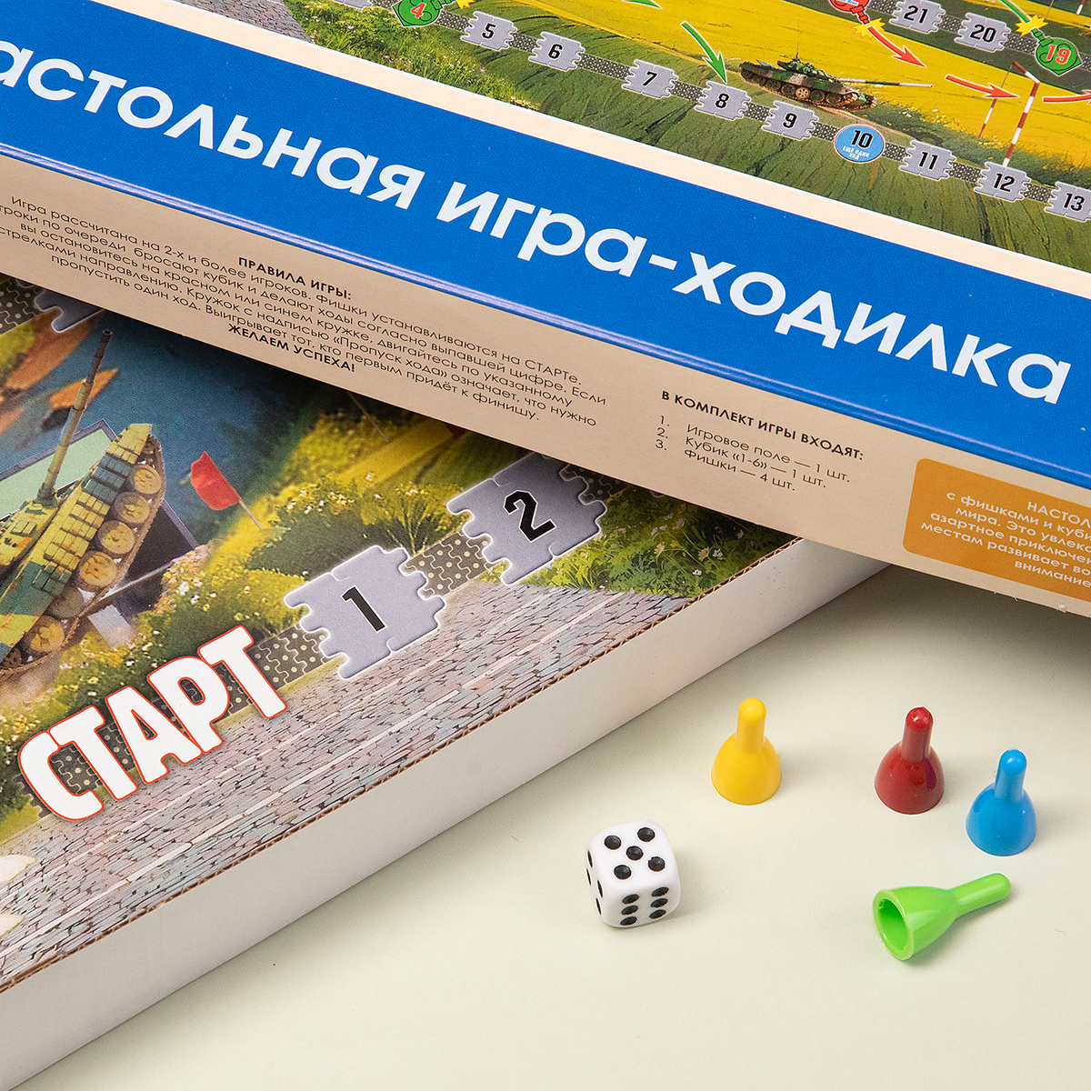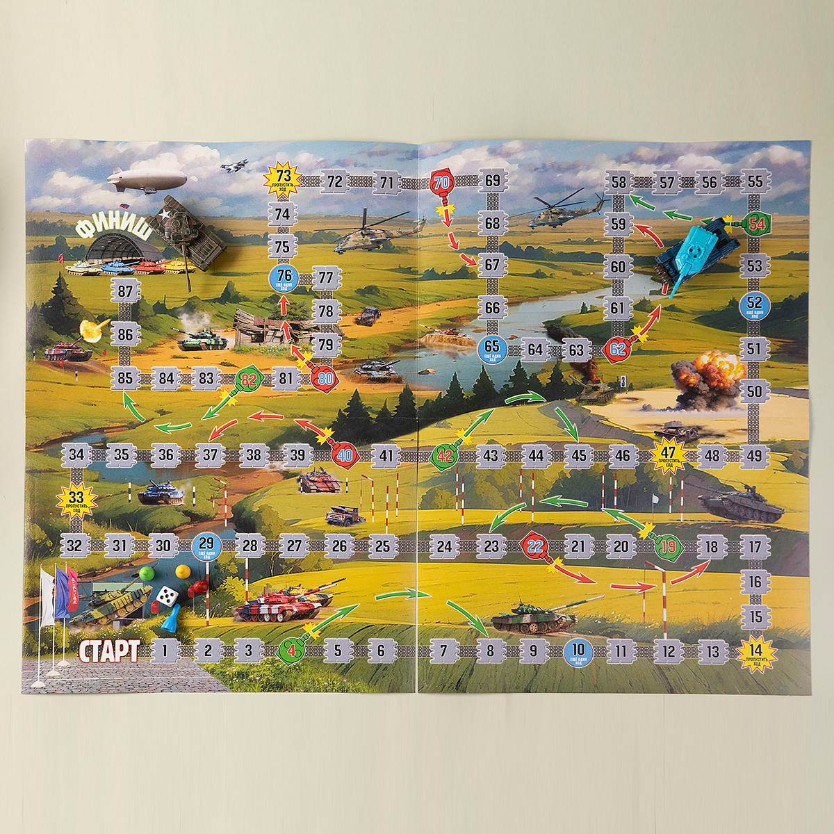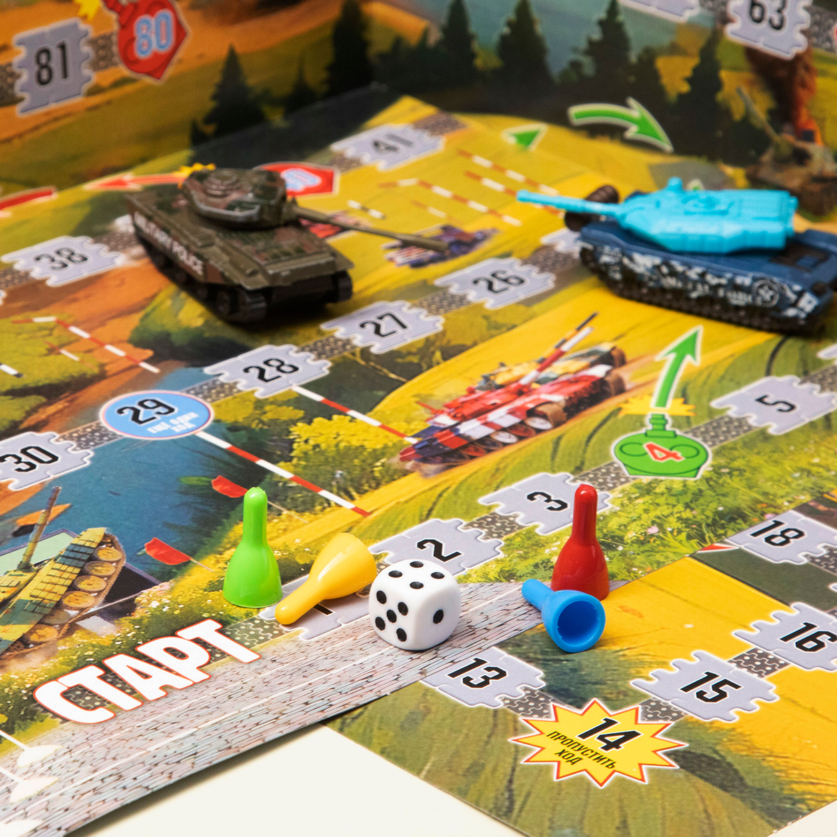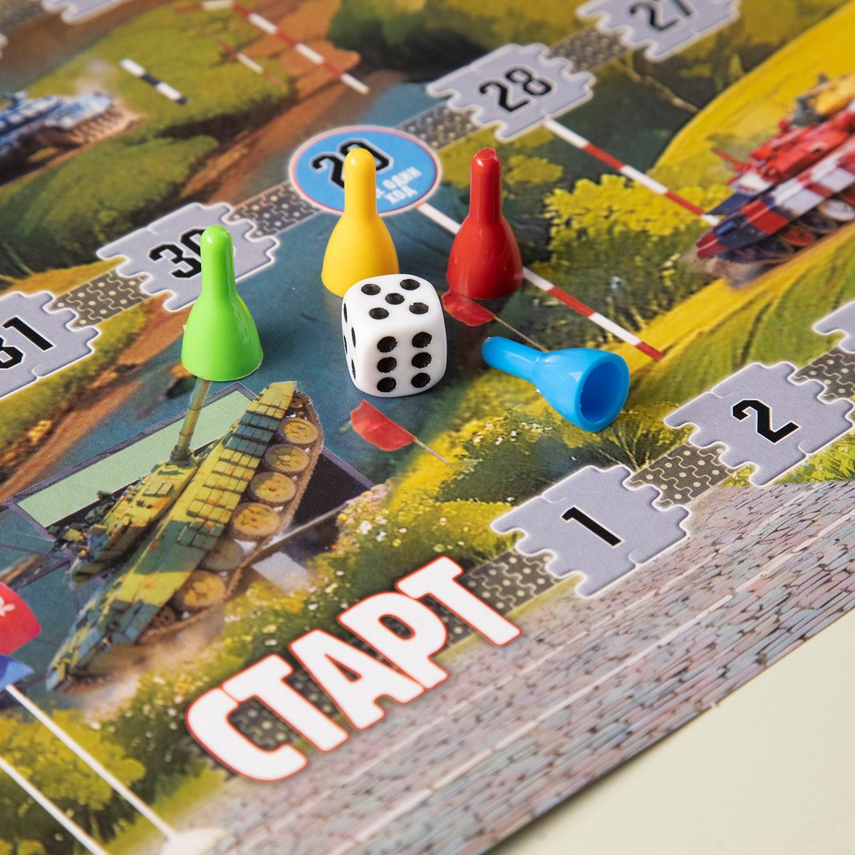 Поле оформлено в стиле военной тематики с танками, вертолётами и другими элементами, что делает игру динамичной и увлекательной. Игроки начинают с позиции «Старт» и соревнуются, чтобы первыми добраться до «Финиша». По пути они встречают различные игровые элементы, которые могут ускорить или замедлить их продвижение. Игра развивает у детей навыки счёта, стратегического мышления и умение следовать правилам.