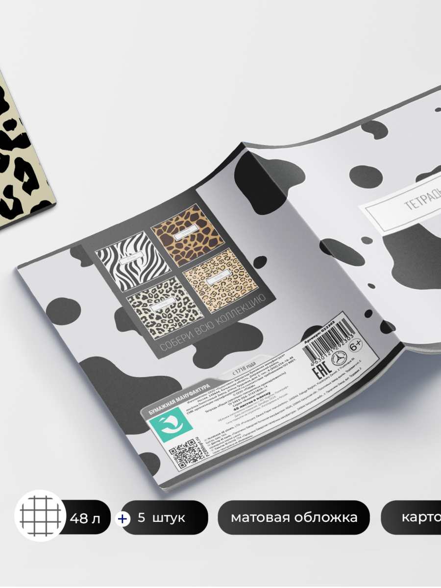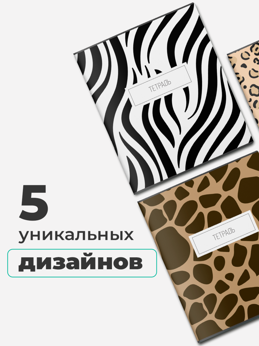 Коллекция, вдохновленная стильными паттернами дикой природы включает 5 уникальных тетрадей с принтами зебры, гепарда, леопарда и коровы.