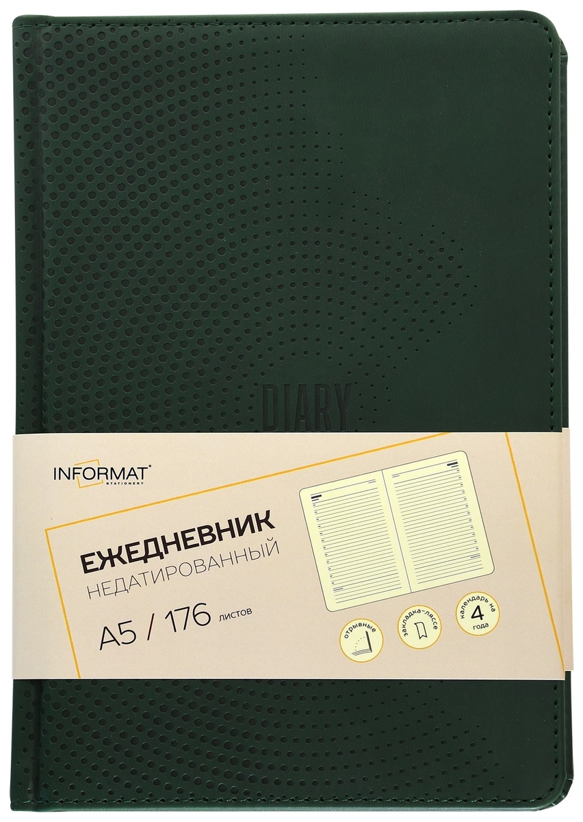 Ежедневник А5 недат. INFORMAT БИЗНЕС 176 л. зелён. тв. обл. тисн. обрез белый ляссе лин.