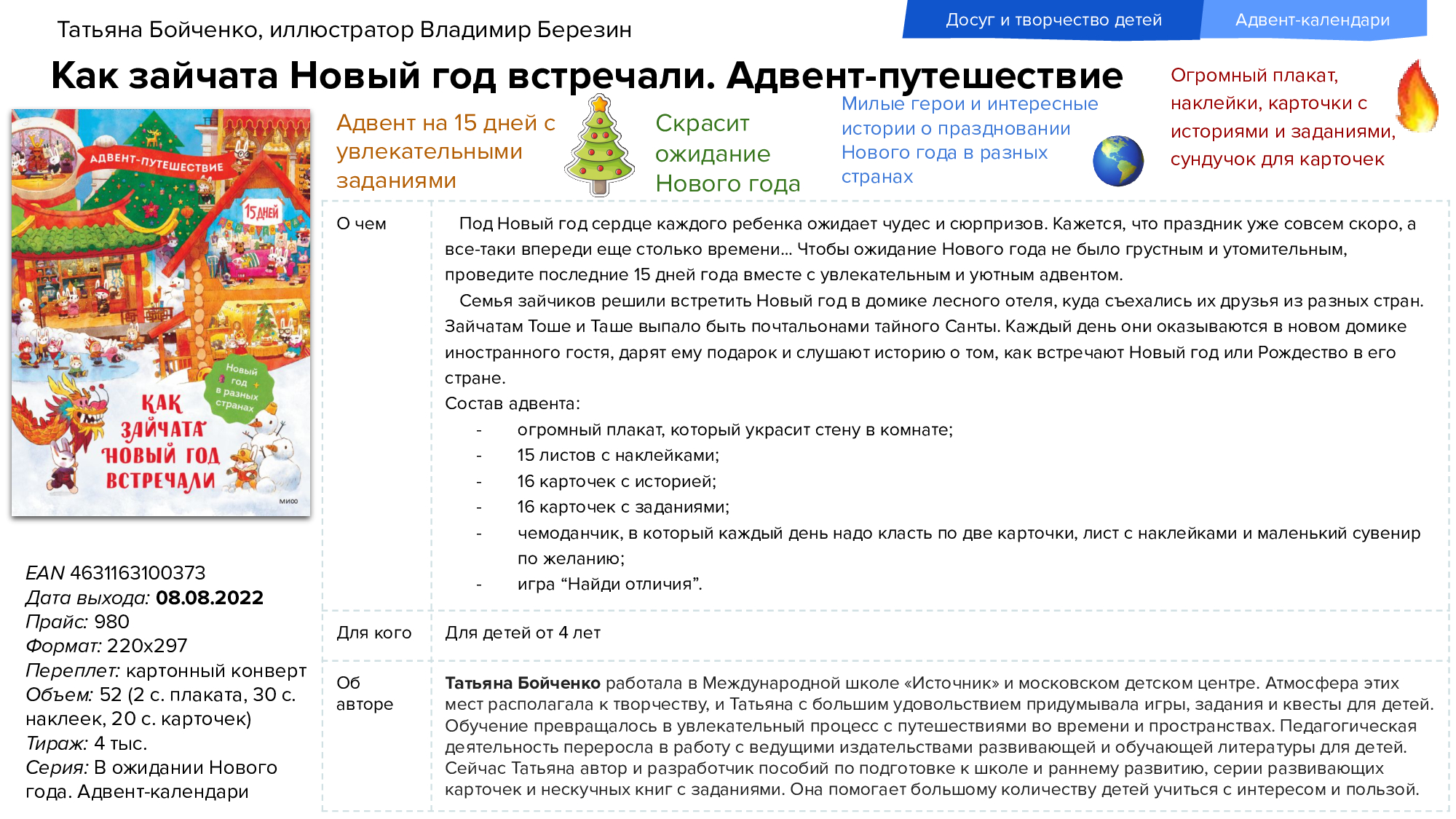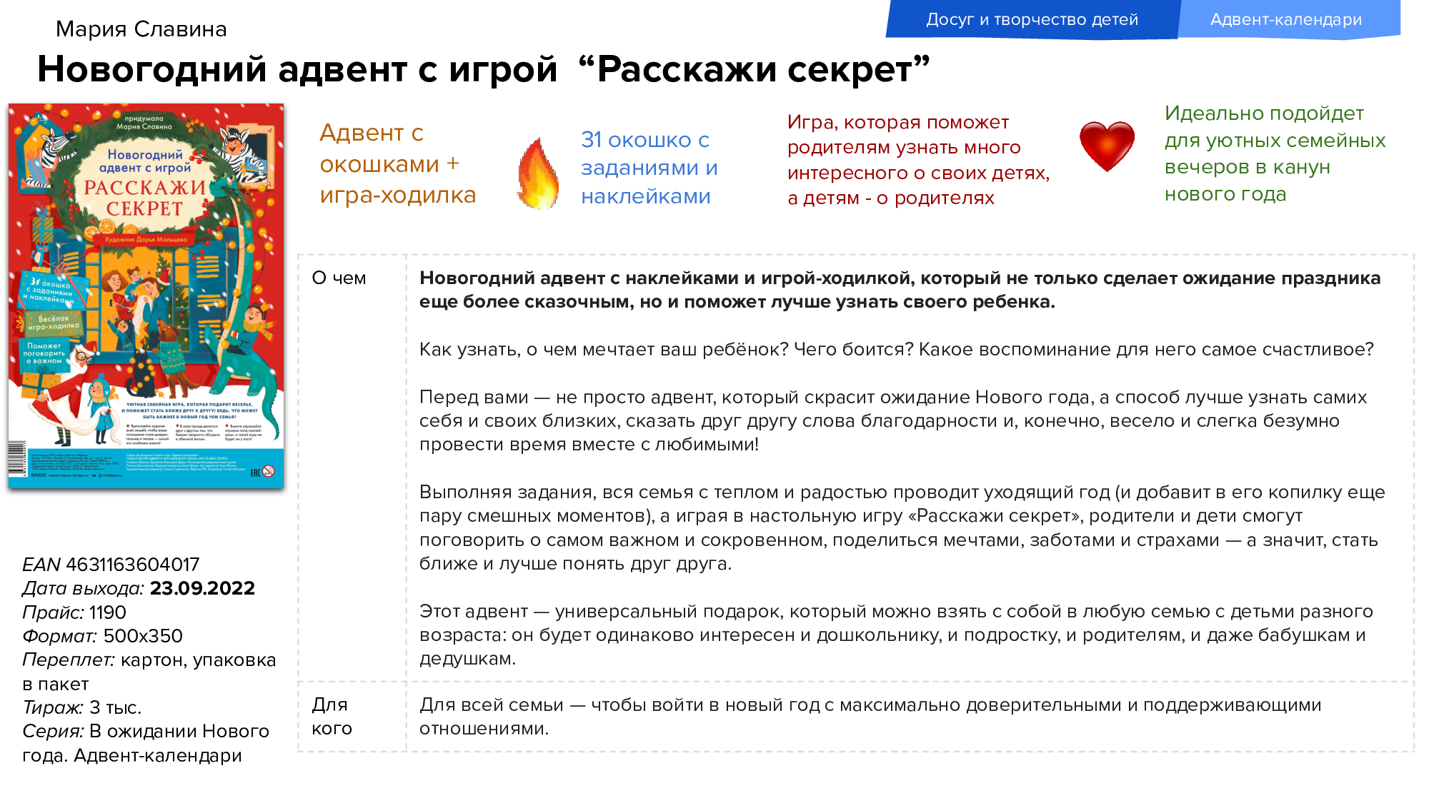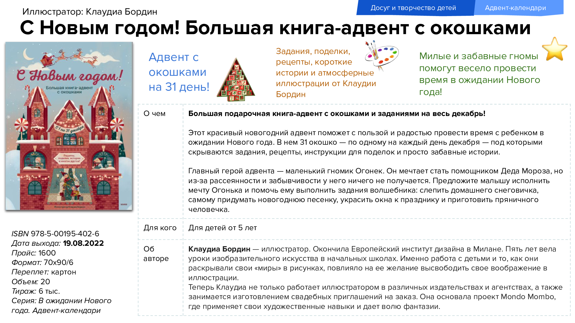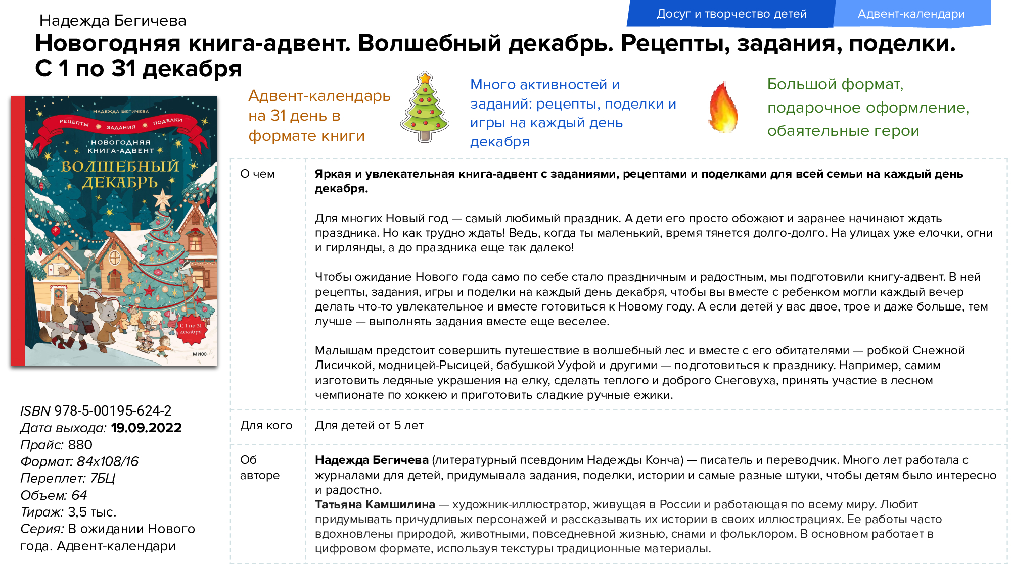 Новый год ближе, чем кажется! Поэтому издательство «МИФ» уже в сентябре представляет новинки для тех, кто больше всего ждёт чуда. Красочные адвент-календари — это книги для самых маленьких читателей с заданиями, рецептами и активностями, участниками которых могут быть все члены семьи. Также в числе новинок детские энциклопедии и другая познавательная литература.