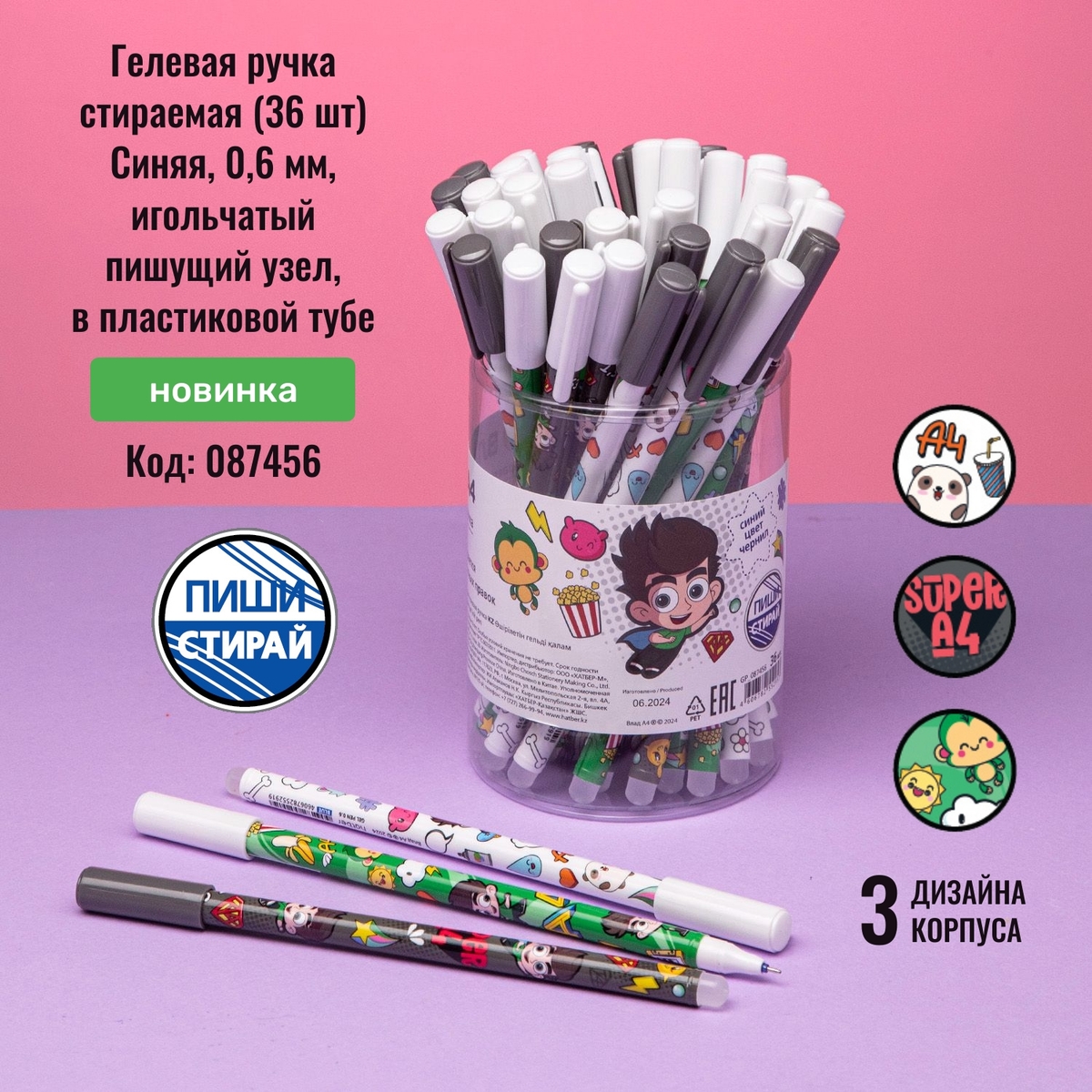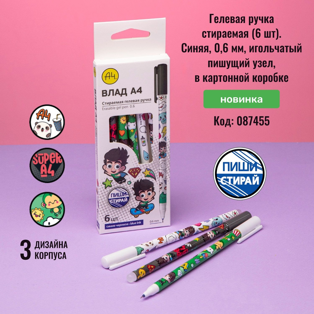 Стираемые гелевые ручки «Влад А4» в упаковках по 6 и 36 штук. Удобные для учёбы гелевые ручки с колпачками и толщиной пишущего узла в 0,6 мм. Три вида динамичных, задорных дизайнов с персонажем Влада. На конце корпуса находится ластик, которым без труда можно подкорректировать или стереть надпись. И никаких больше ошибок!
