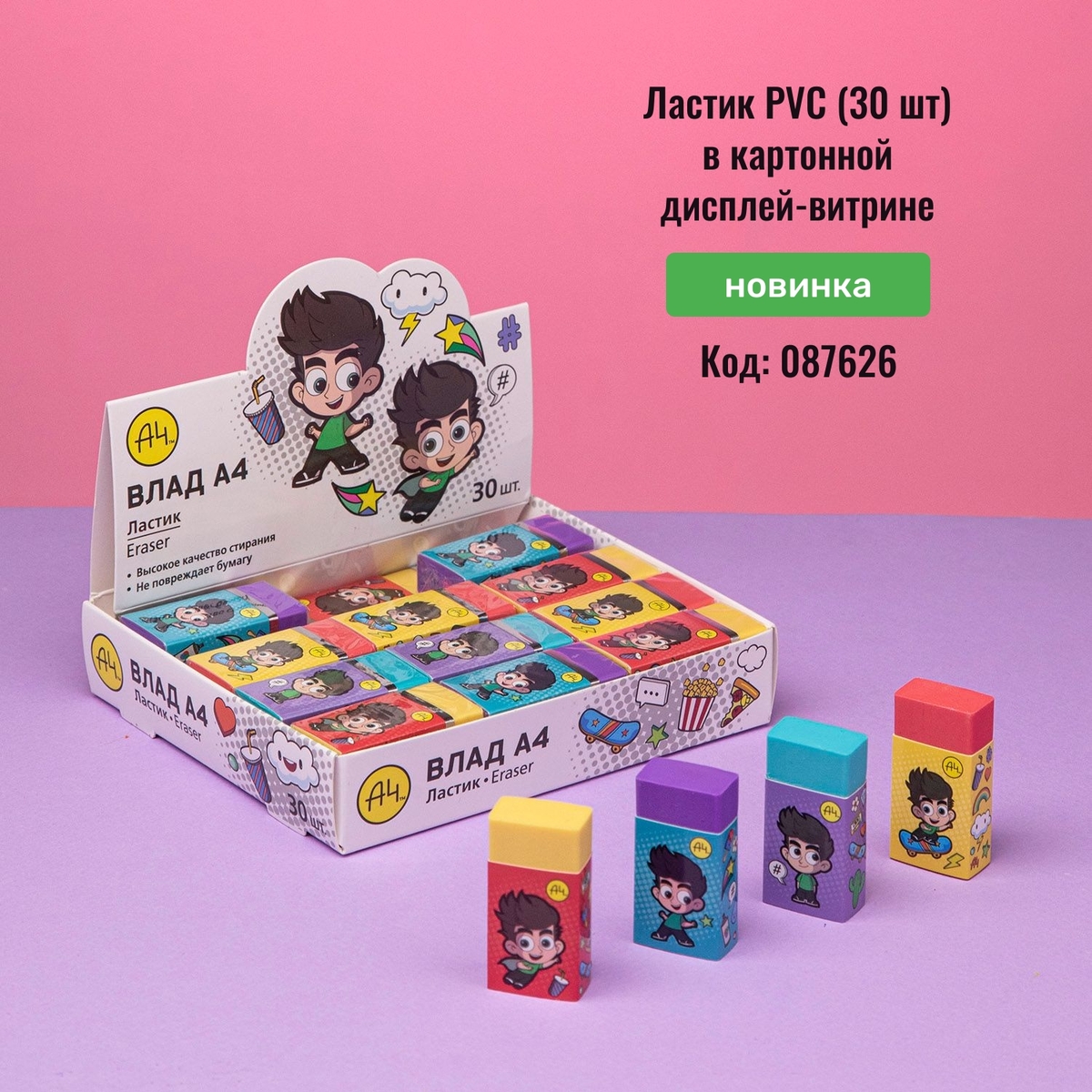 Ластик PVC «Влад А4» в картонной дисплей-витрине по 30 шт. Яркие, удобные, отлично стирающие даже на тонкой бумаге ластики однозначно займут свое место в детском пенале. Сами ластики одноцветные, а картонные футляры представлены в четырёх стильных пёстрых дизайнах с мультяшным персонажем Влада.