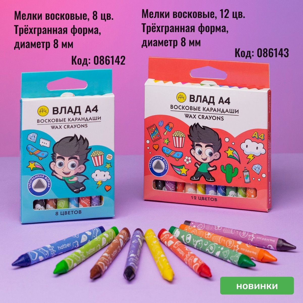 Восковые мелки «Влад А4» в ярких картонных коробках по 8 и по 12 штук. Отличный выбор для детского творчества: у мелков приятный динамичный дизайн, яркие цвета, удобная, эргономичная трёхгранная форма, с которой рисовать можно долго и увлечённо!