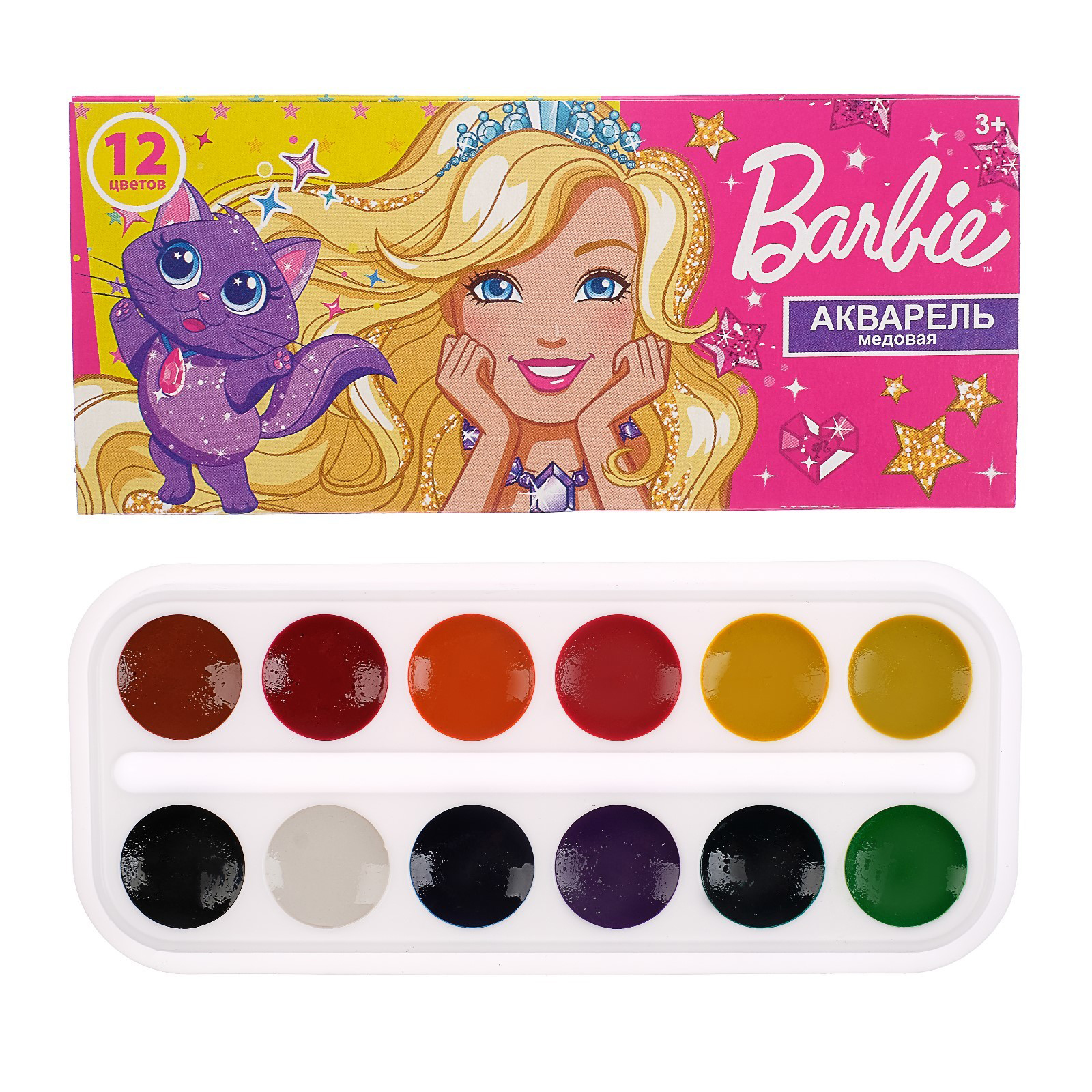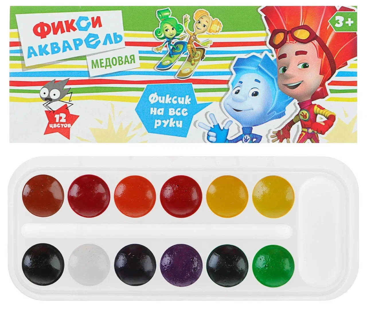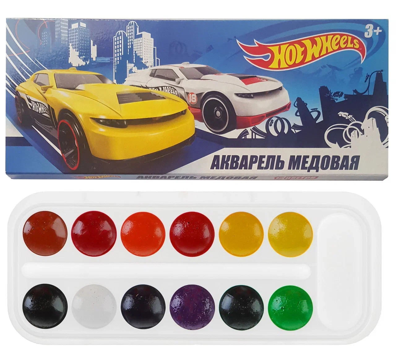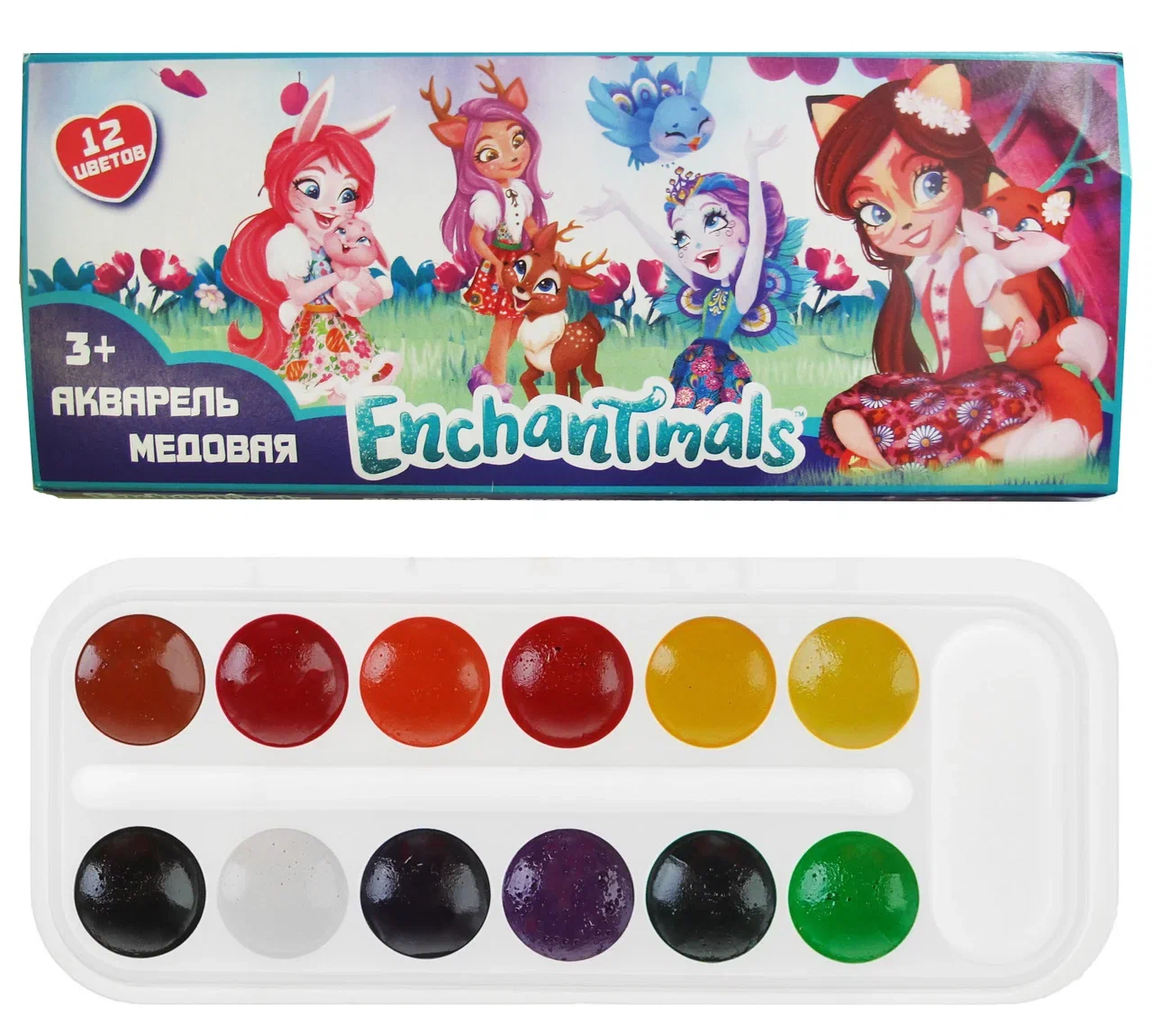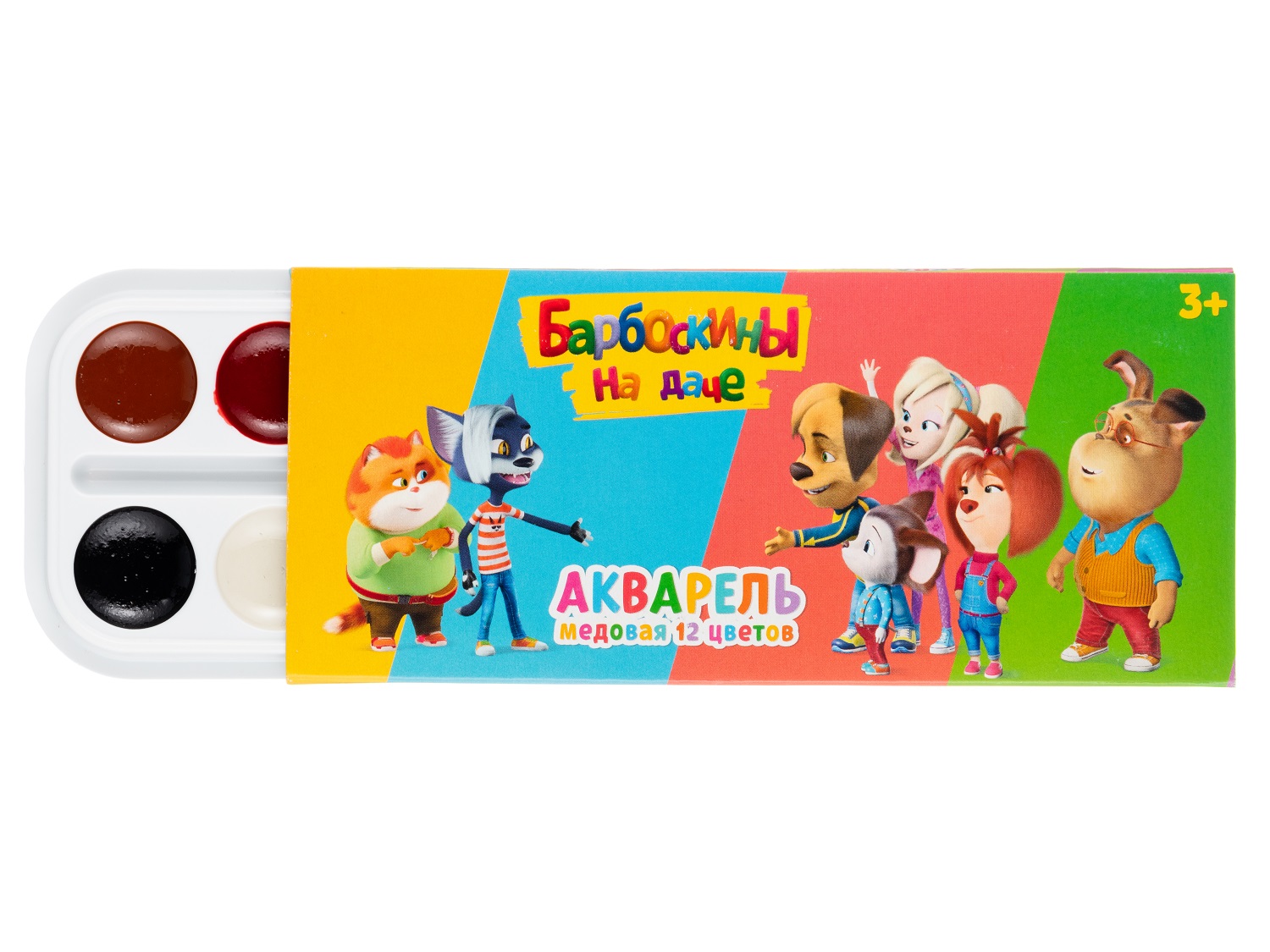 Наборы состоят из 12 цветов. Акварель представлена на удобном пластиковом поддоне с отсеками для красок, кисточки и смешивания цветов. Для удобства хранения и переноски имеется картонная коробка. Кисточка в комплекте не предусмотрена. Предназначено для детей от 3 лет.