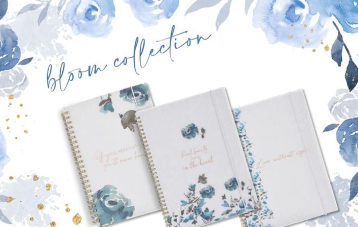 Bloom — канцелярия в нежных голубо-серых оттенках, с цветочным акварельным принтом. В этой коллекции вы найдете все самое необходимое для планирования и поддержания порядка на рабочем месте: бизнес-тетради, папки на кольцах, папки-конверты на кнопке и молнии, папки-уголки, блокноты и тетради.