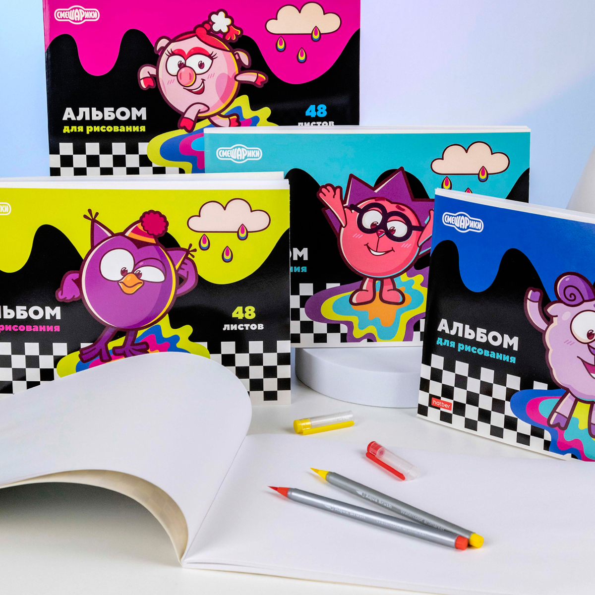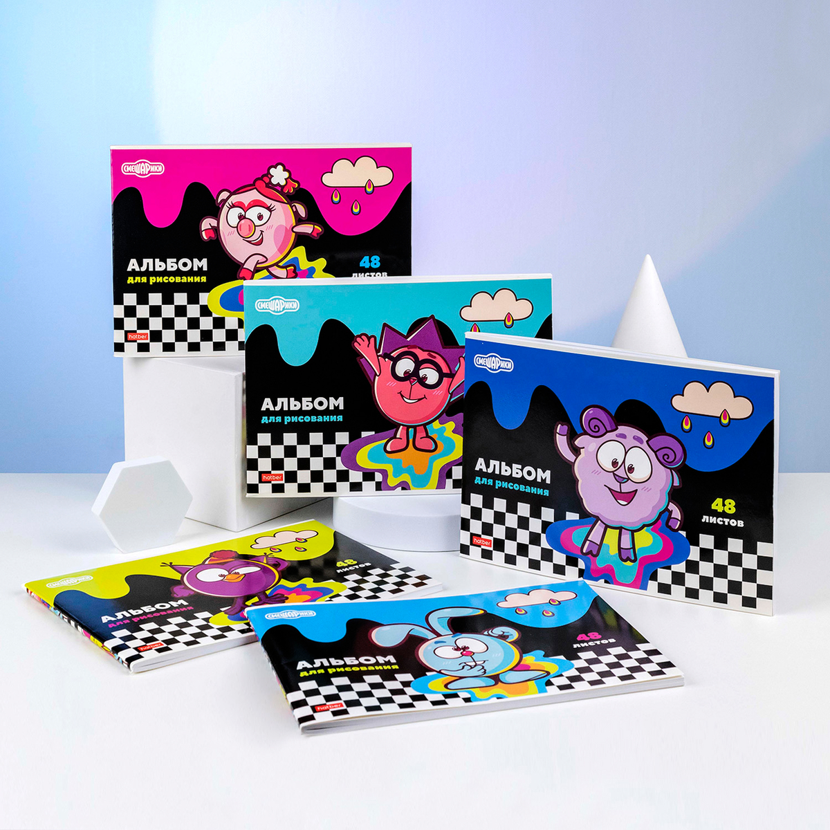 Лицензионные альбомы для рисования «Смешарики» от Hatber собрали пятерых персонажей, по одному на каждую яркую и весёлую обложку. Модный орнамент в чёрно-белую клетку дополняет композицию обложек и добавляет им характер!