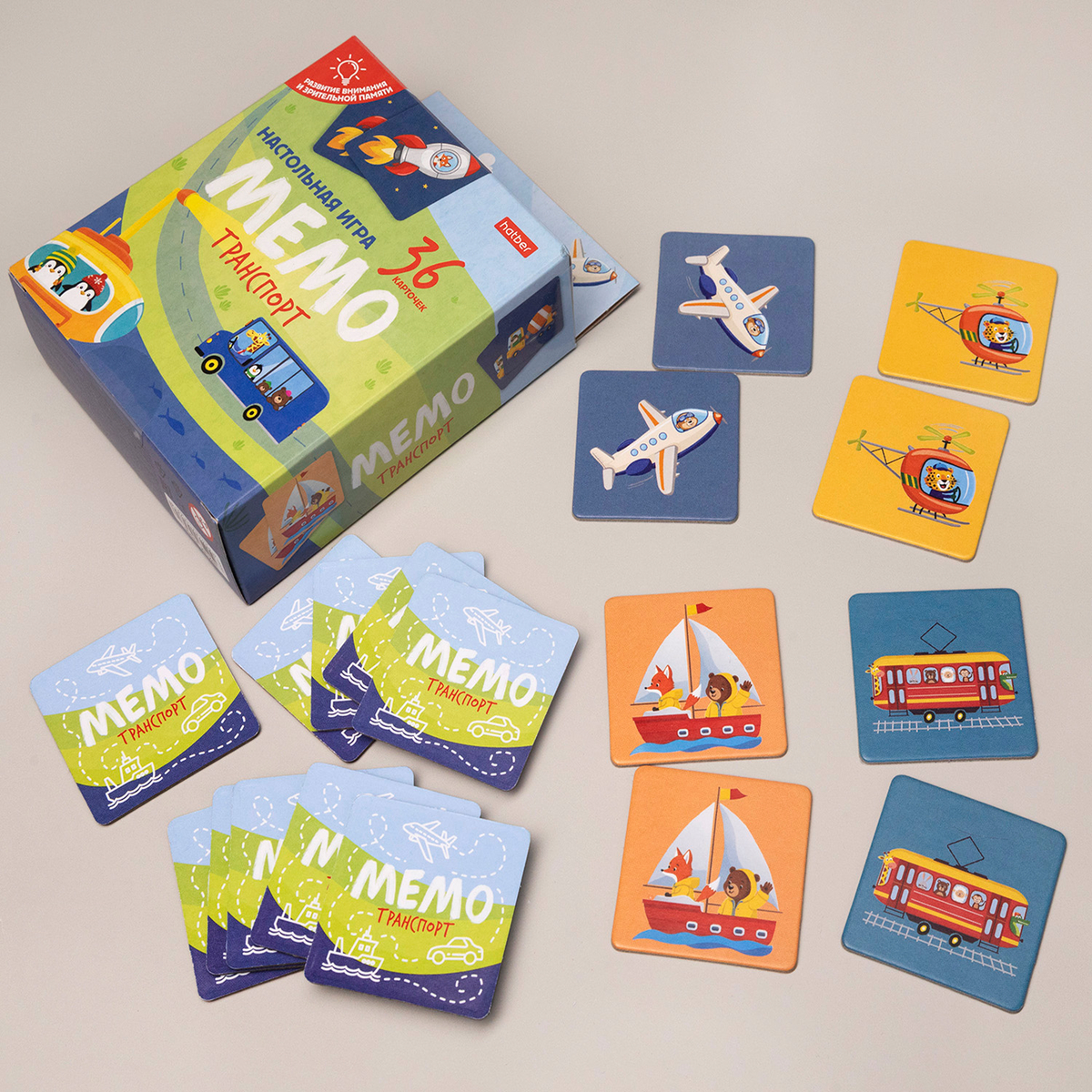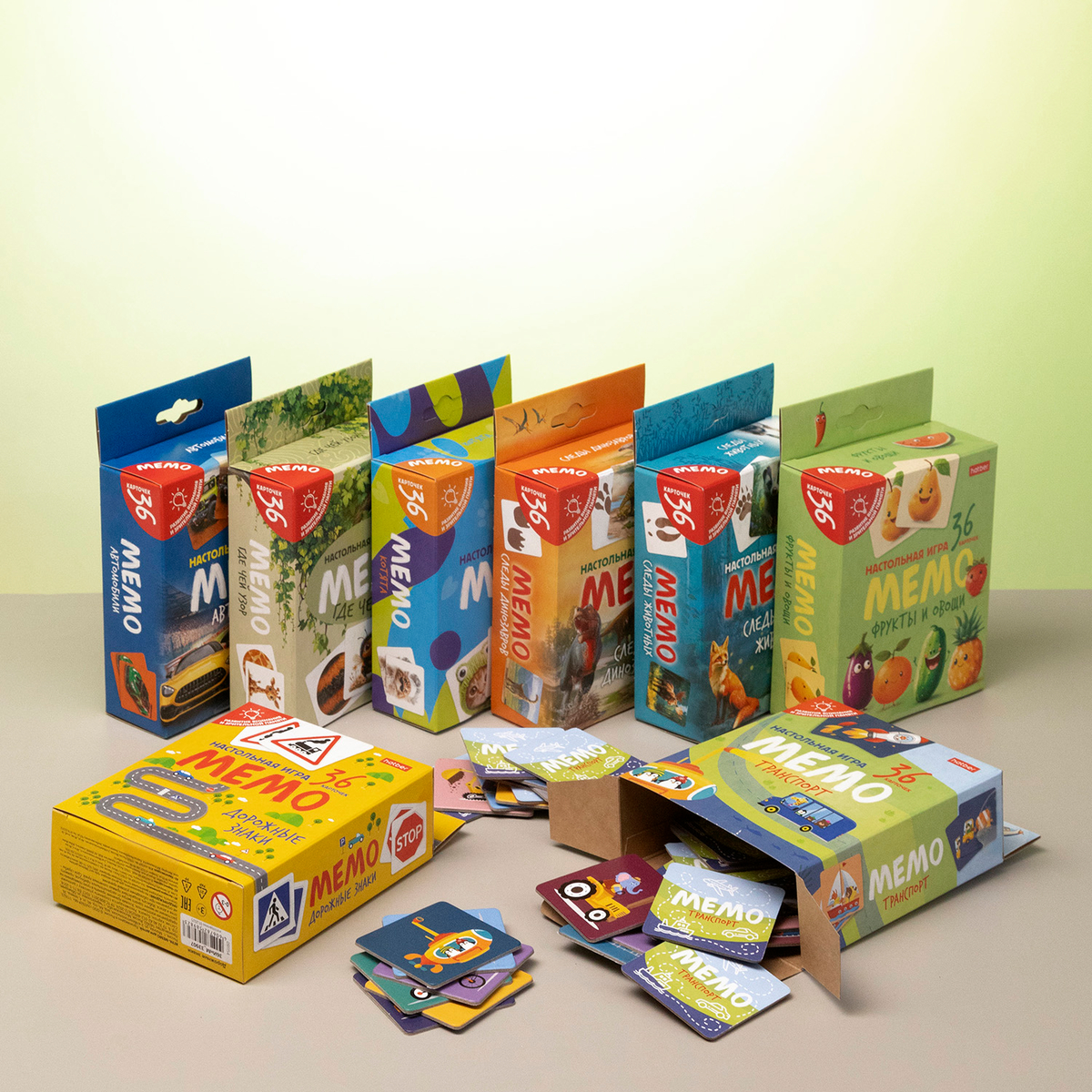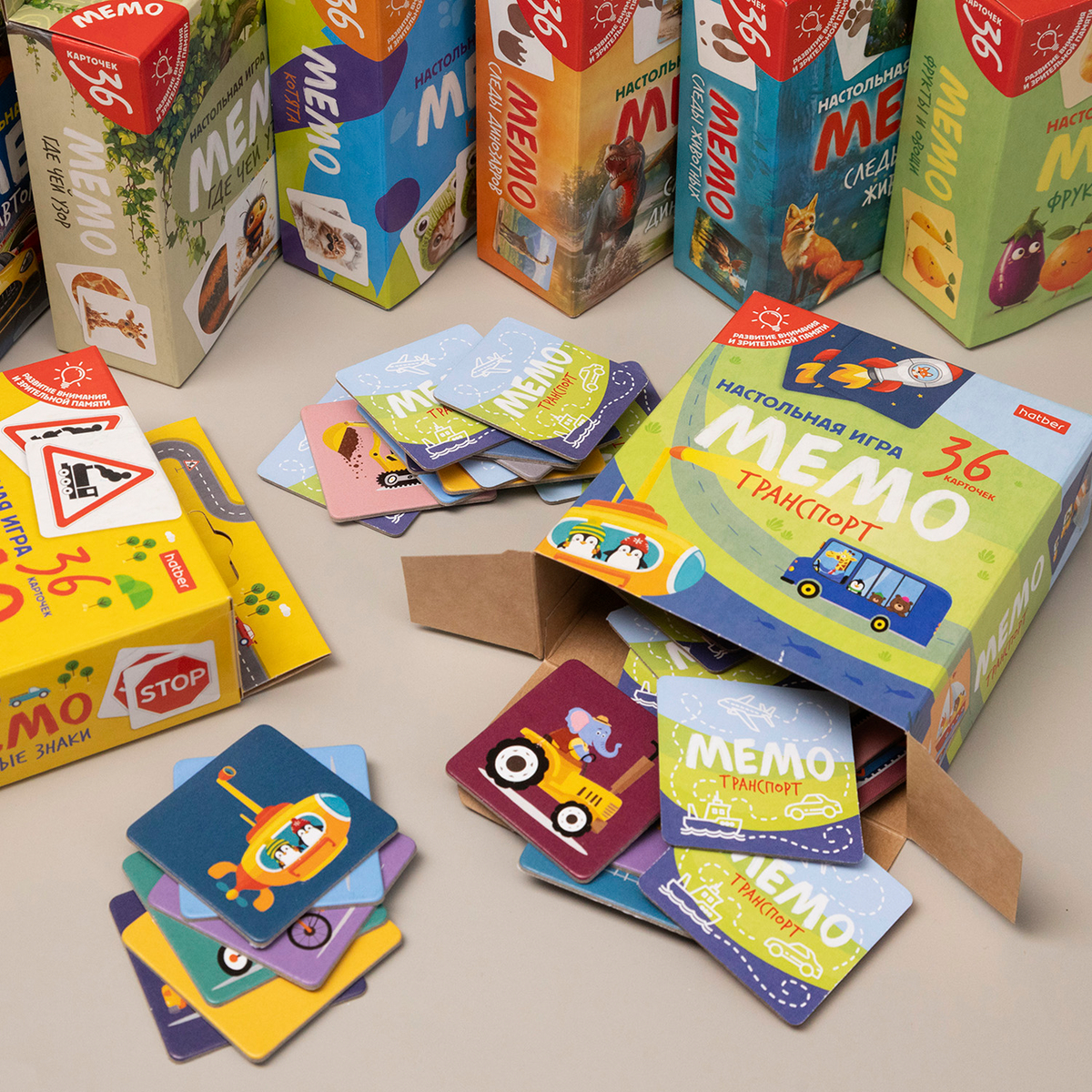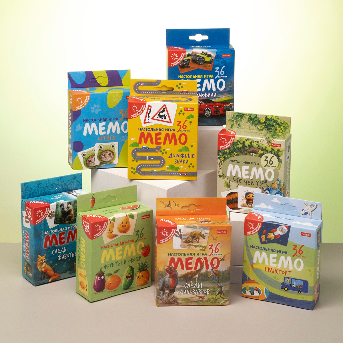 Каждая коробка содержит 36 карточек с красочными изображениями. Все игры МЕМО представлены в индивидуальной упаковке с европодвесом.