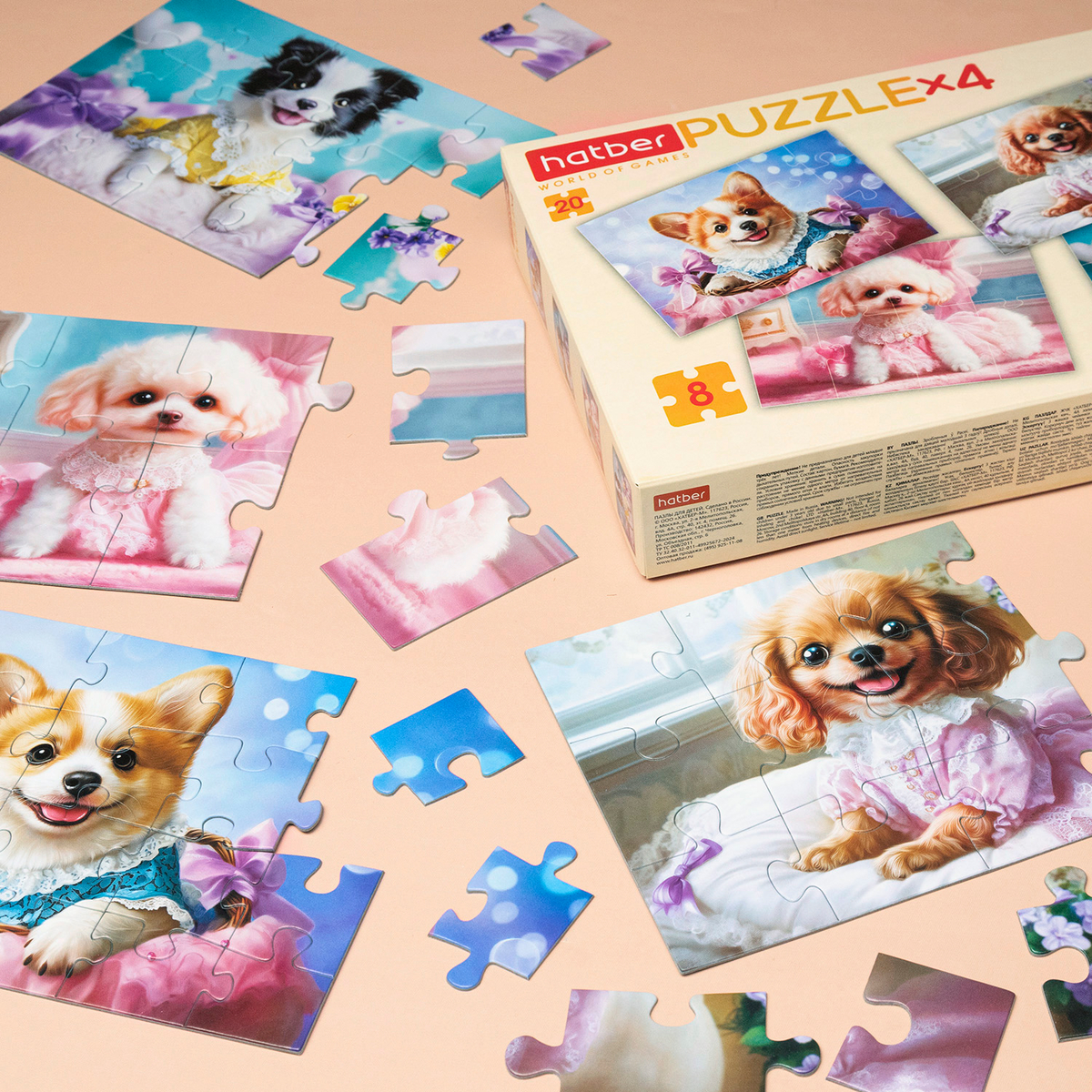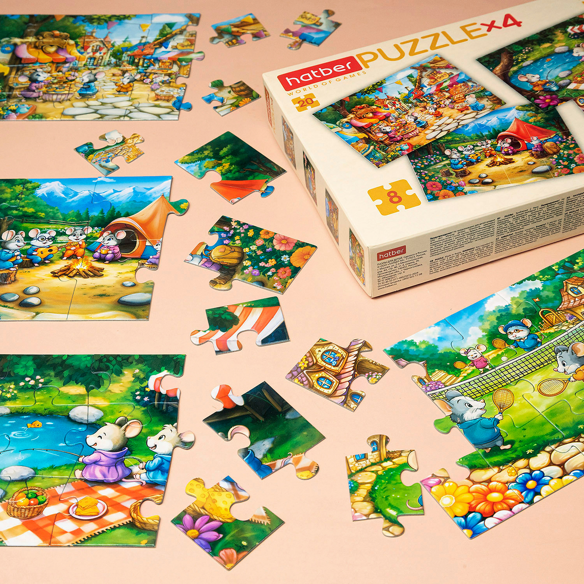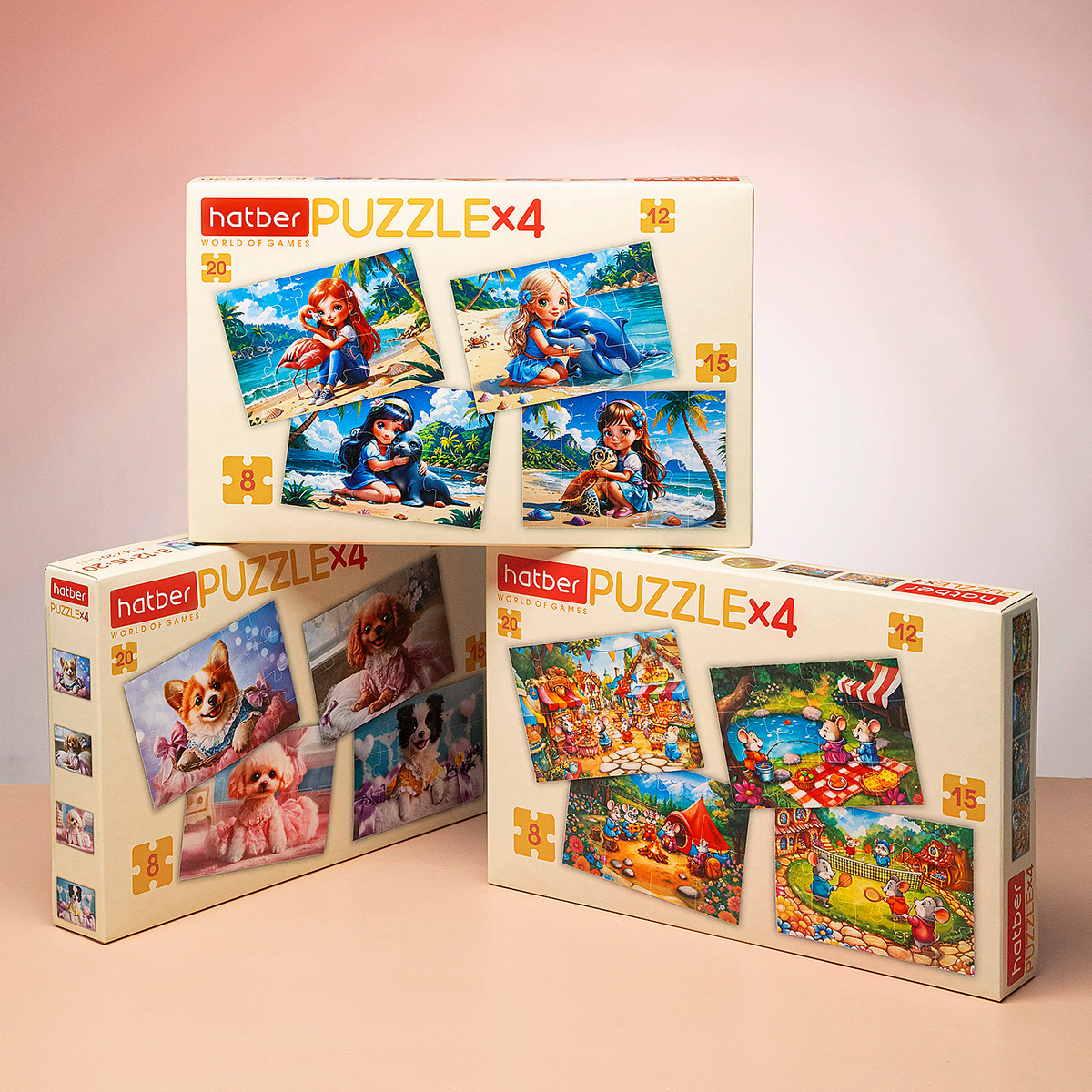 Иногда одного сюжета — мало. Поэтому Hatber выпускает целую серию пазлов «4 в 1», где в каждой коробке — сразу четыре картинки. Собирай мышат, принцесс и пёсиков — по порядку или по настроению. В каждой коробочке пазлы разной сложности: 8, 12, 15 и 20 деталей, чтобы расти от простого к интересному.