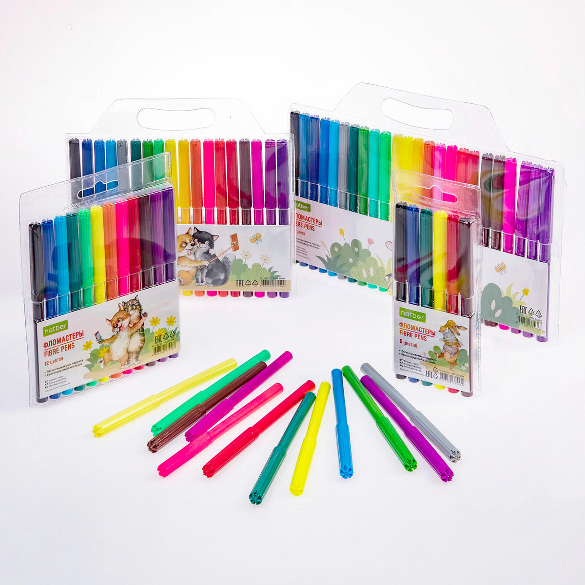 Фломастеры представлены в блистерах с европодвесом по 6, 12,18 и 24 цвета.