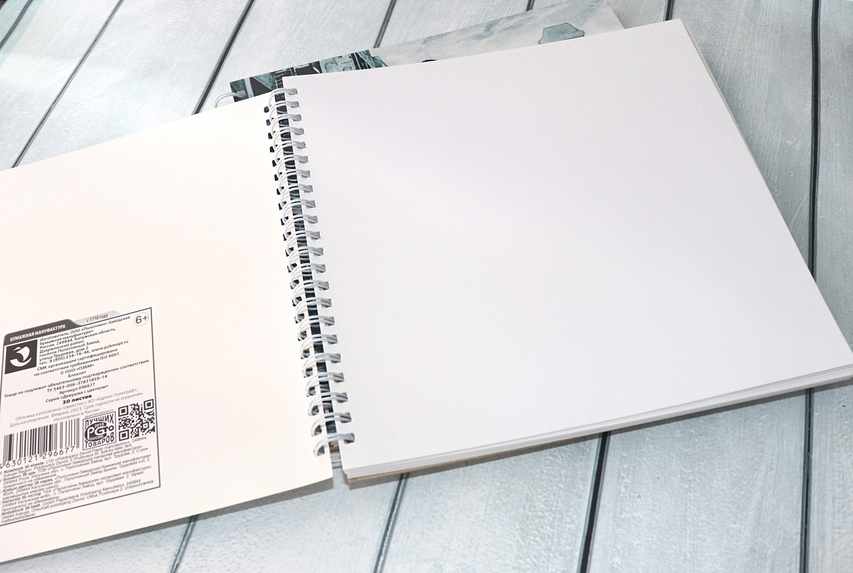 Бумага плотностью 235 г/кв. м толстая и плотная, что делает её идеальной для рисования и скетчинга. Она не просвечивает и позволяет использовать различные инструменты и материалы.