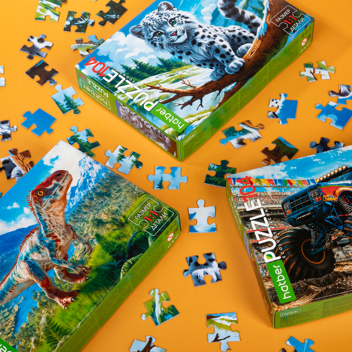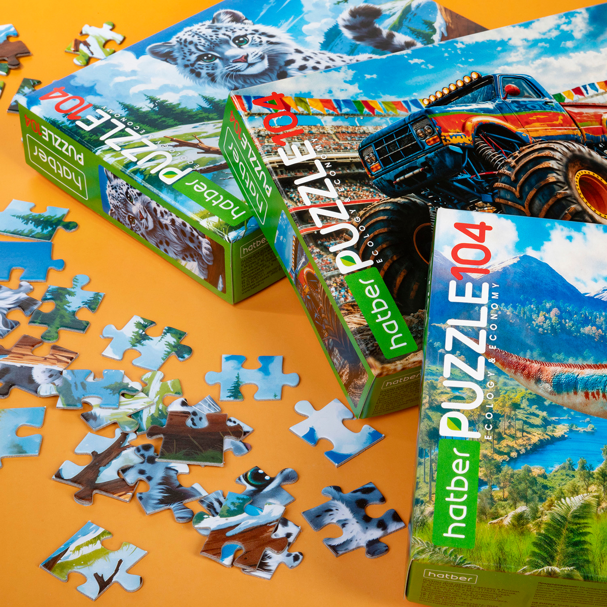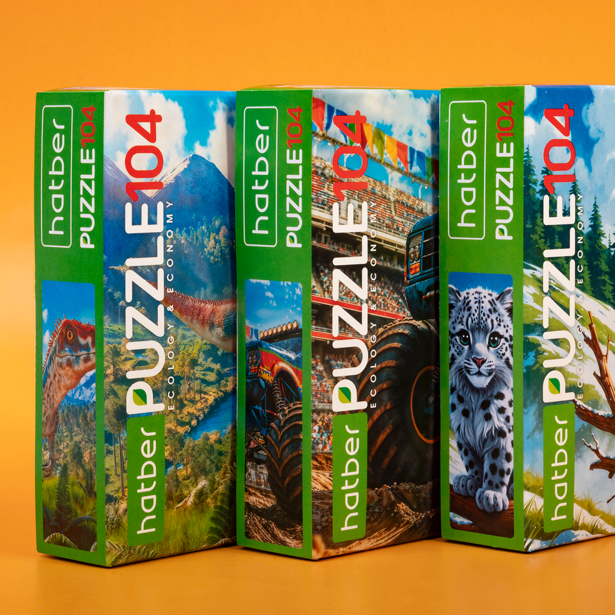 Когда хочется чего-то захватывающего, но при этом увлекательного, выбирайте ECO Puzzle 104 от Hatber! В этой серии три мощных сюжета: снежный барсик, монстр-трак и доисторический хищник. Это не просто пазлы, а настоящая экспедиция в мир скорости, дикой природы и древних тайн.