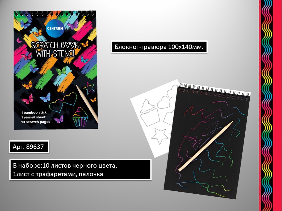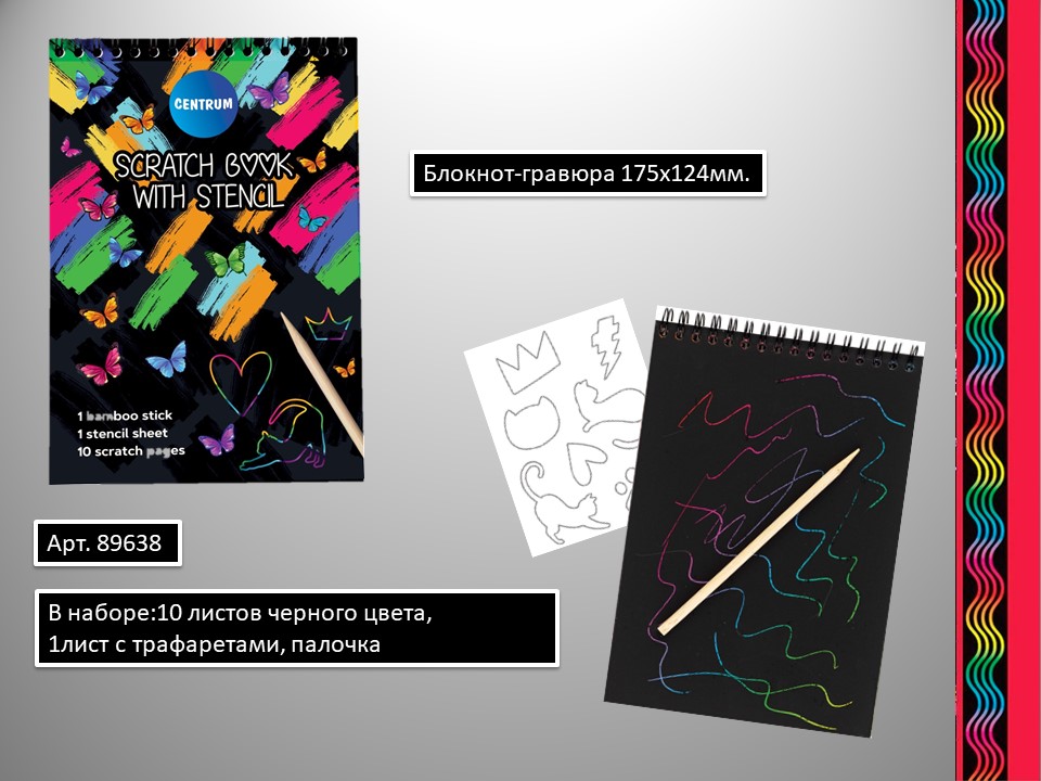 Создание гравюр – одно из популярных изобразительных направлений, требующих усидчивости и внимательности. Данная техника способствует развитию координации, мелкой моторики, творческих способностей. А еще это очень увлекательно, с блокнотами – гравюрами от Centrum каждый сможет творить в свое удовольствие. В комплекте предусмотрена бамбуковая палочка – штихель, абсолютно безопасная при использовании по назначению, благодаря чему данные наборы доступны даже для самых маленьких детей. Гравюра – представляют собой картонную основу, нанесенную двумя слоями краски с готовым эскизом или без него. Произвольное рисование на листах без эскиза позволят дать волю фантазии и изобразить эффектные и оригинальные рисунки. Также в каждом блокноте предусмотрены трафареты с различными фигурами. Гравюра создается путем процарапывания верхнего слоя краски по имеющемуся контуру или самостоятельно. На листах блокнотов можно рисовать что угодно, делать надписи, наброски и целые композиции. Яркая радужная краска, скрывающаяся под основой преобразит любой рисунок, а удобный формат в виде блокнотов позволит наслаждаться творчеством не только дома, но и в поездках и путешествиях.