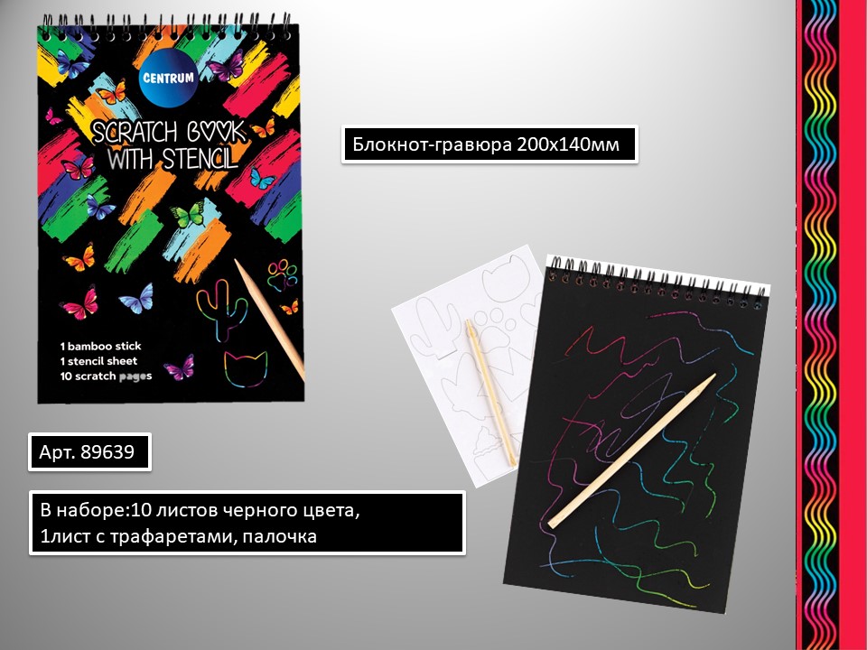 Арт.: 89639 Блокнот – гравюра на гребне (10 листов), бамбуковая палочка, 1 лист с трафаретами. Размеры: 200*140 мм.