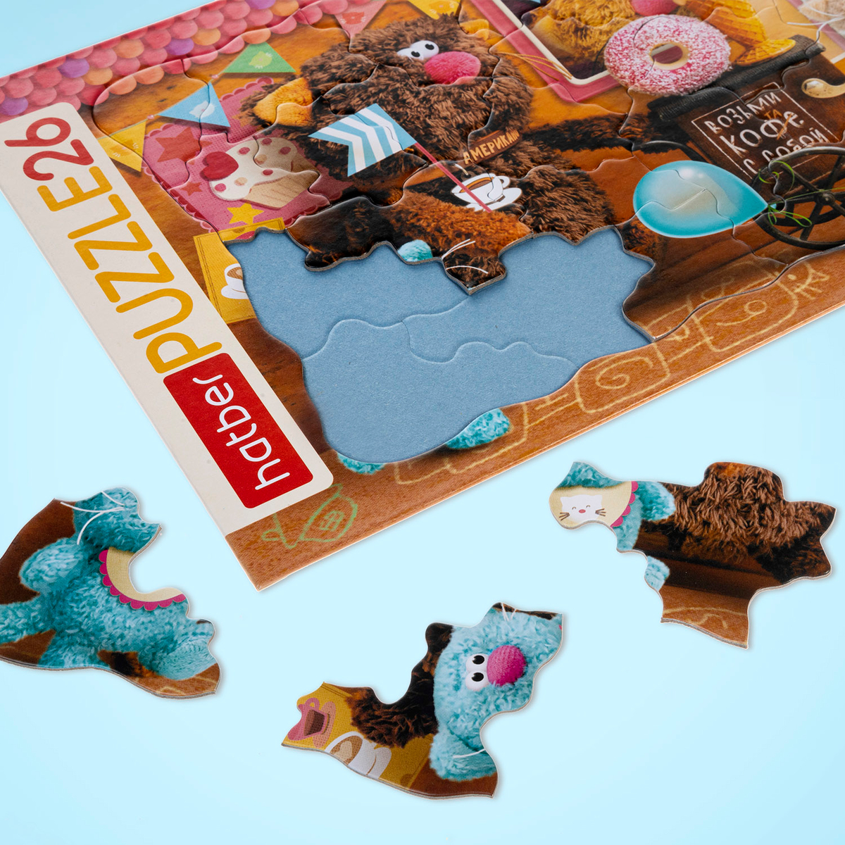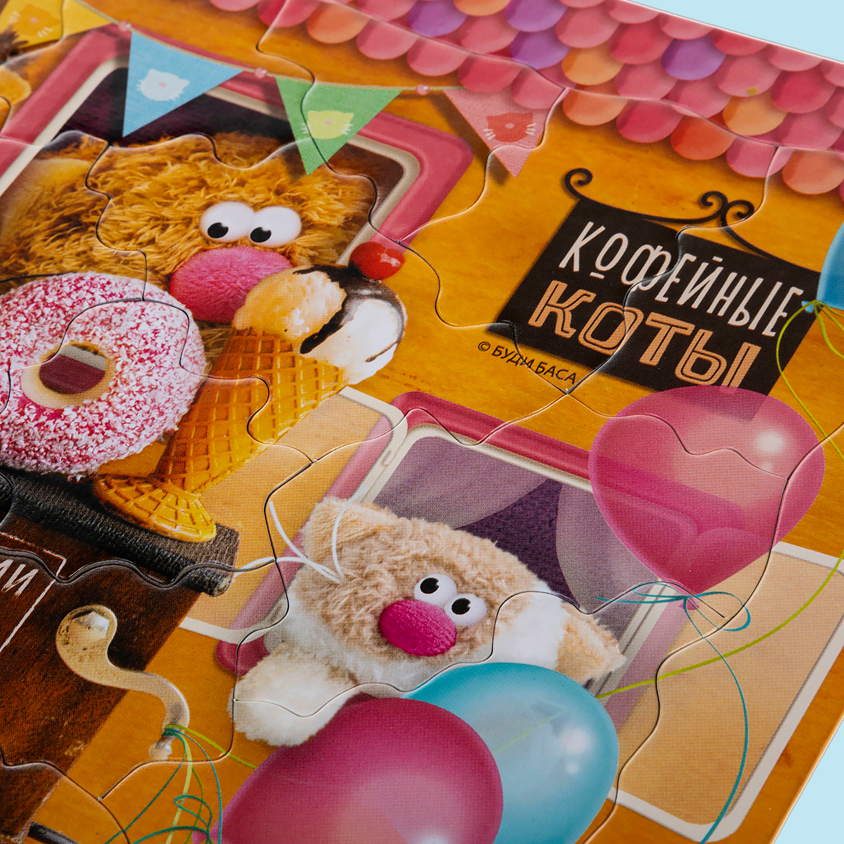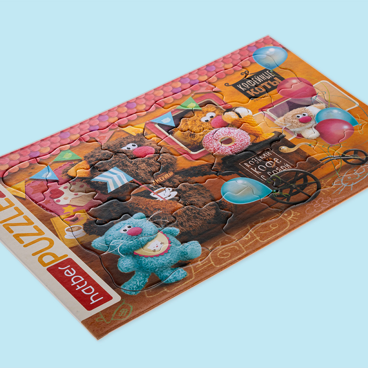 Плюшевые коты, пончики, мороженое и шарики превращают картинку нового пазла в весёлую кофейню, где за стойкой работают мягкие и очень дружелюбные бариста. Яркий сюжет сразу цепляет внимание: один кот держит кружку кофе, другой позирует с огромным пончиком, рядом малыши‑игрушки и праздничные гирлянды на тёплом фоне.