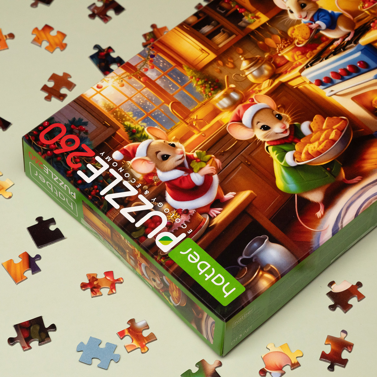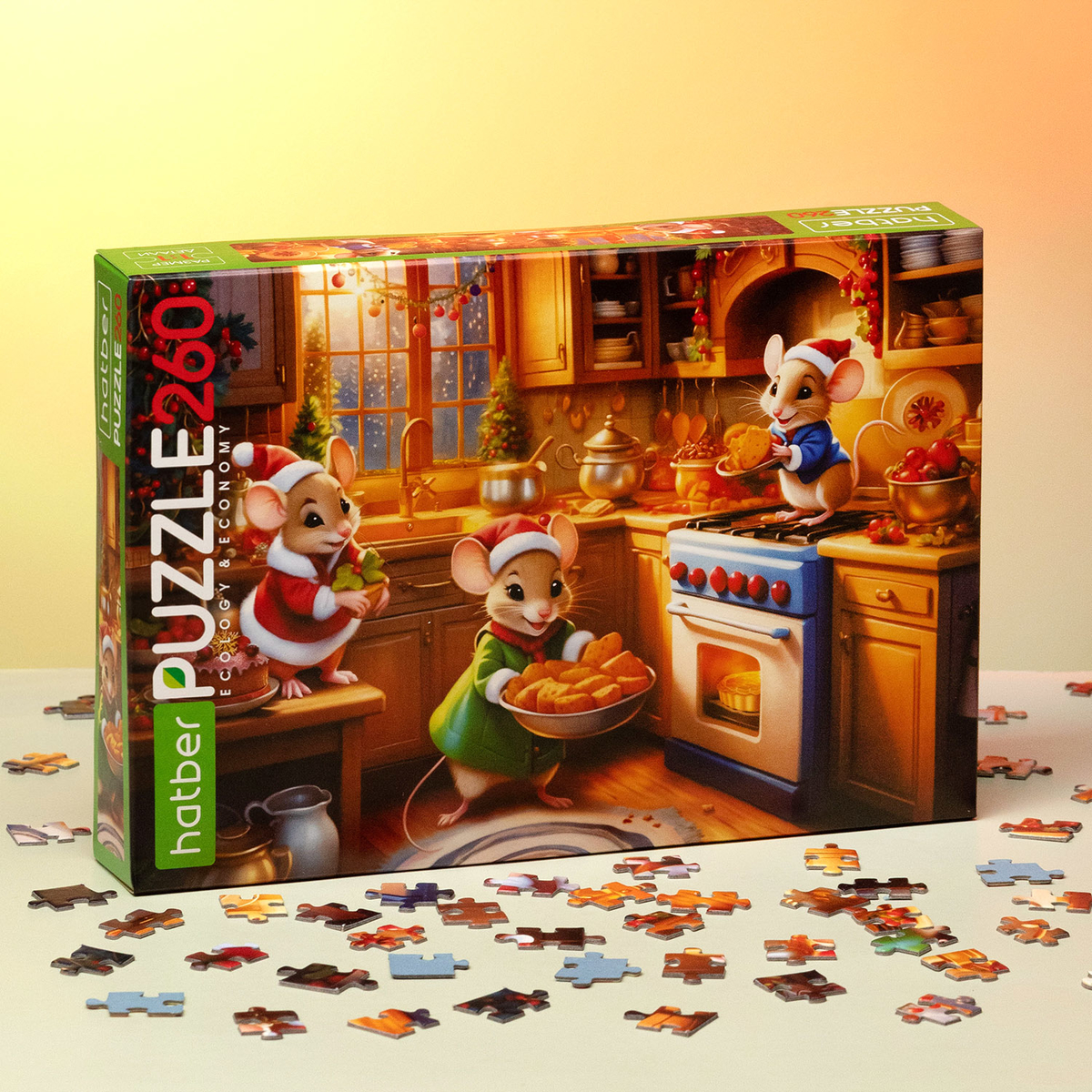 Новый пазл идеально подходит для детей, которым нравится не просто играть, а участвовать в процессе, который приносит радость. Композиция яркая и детализированная: нарядная кухня, весёлые мышки в праздничных костюмах, духовка с выпекающимся угощением. Собираешь — и словно сам становишься участником маленького кулинарного волшебства. И, честно, сложно удержаться, чтобы не пойти на кухню и не испечь что-то вкусненькое!