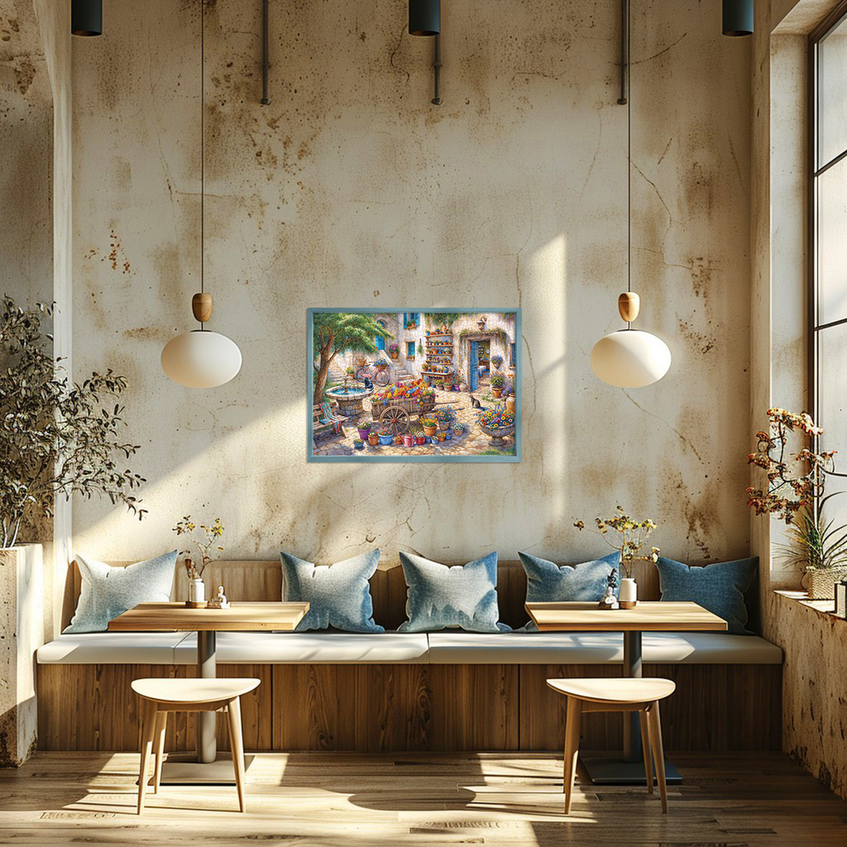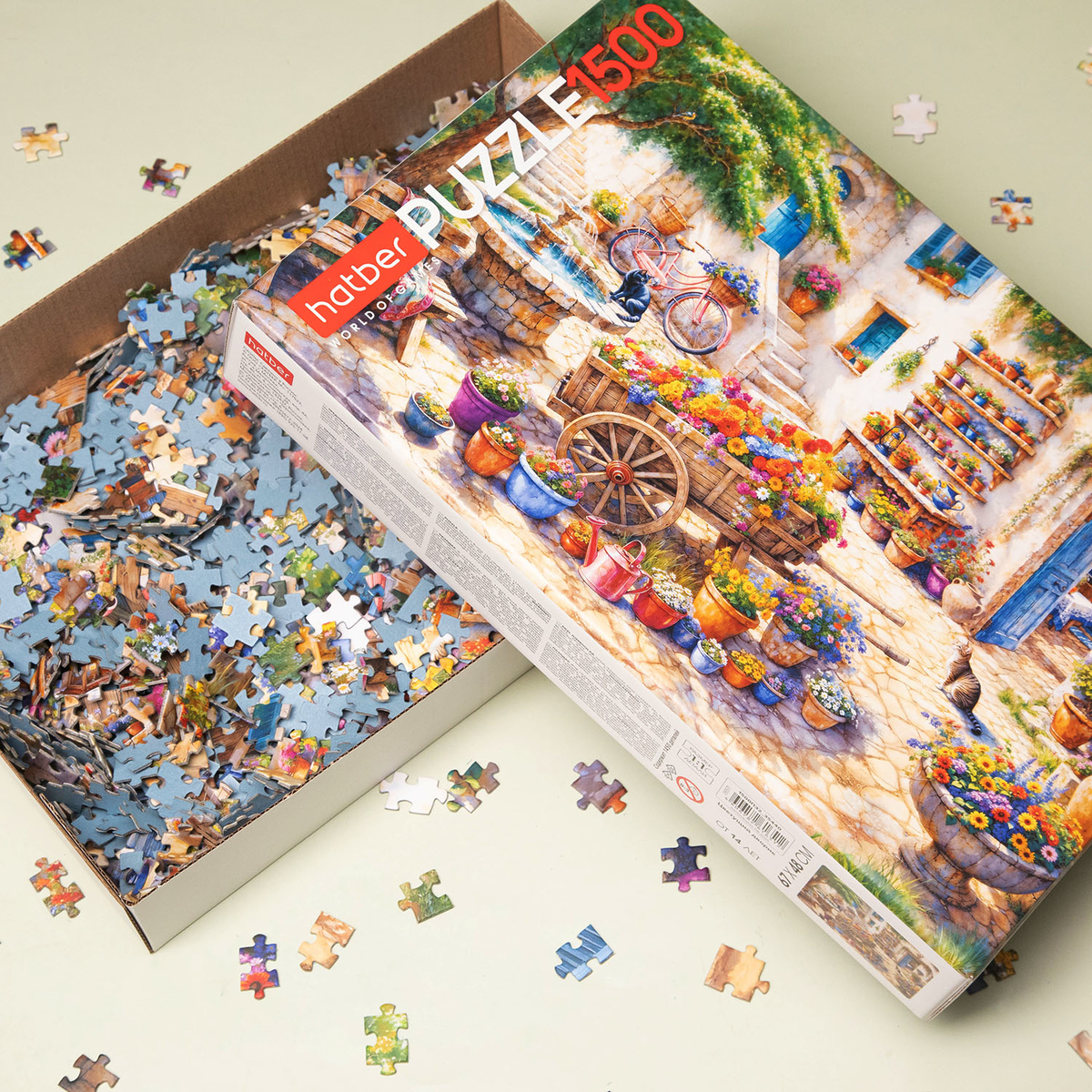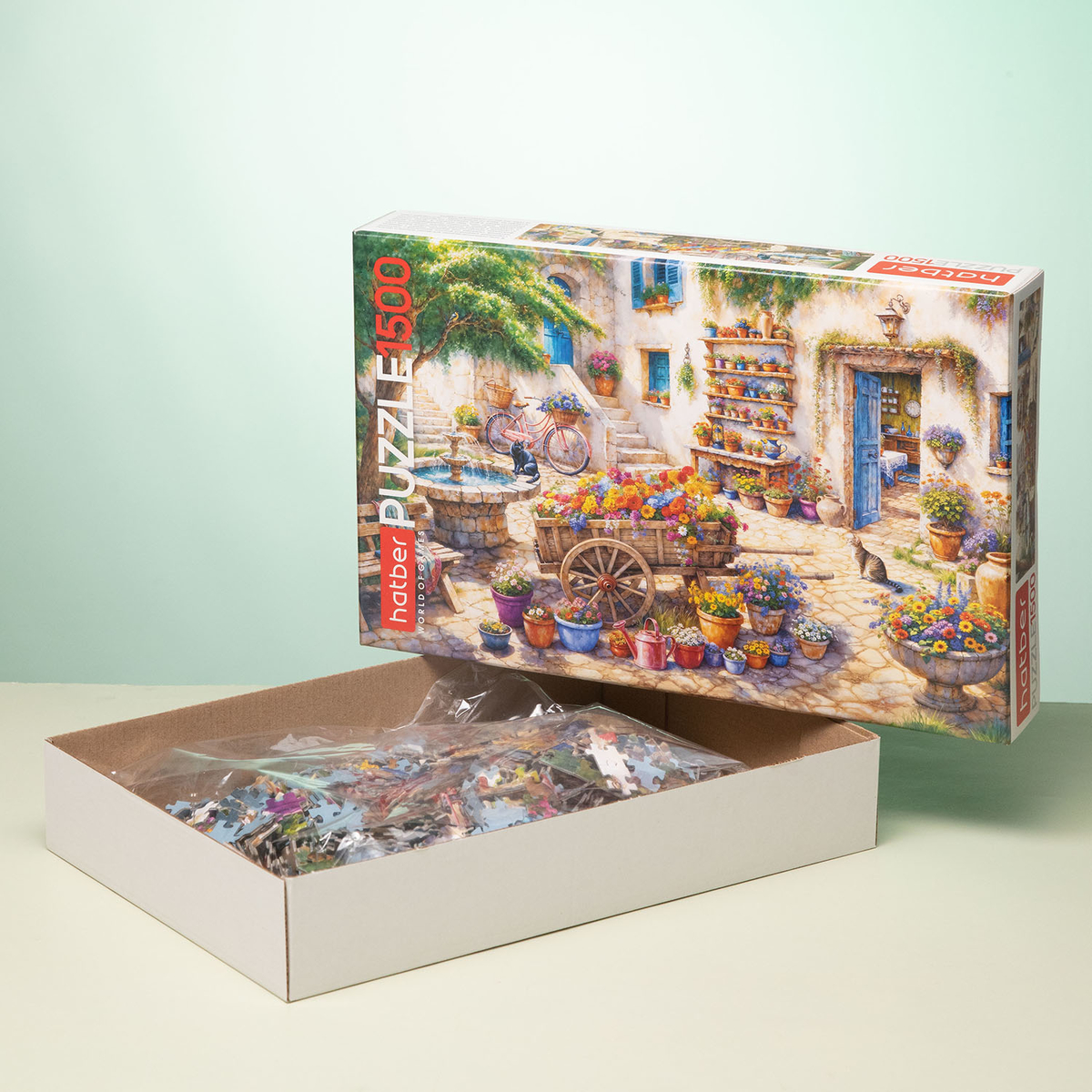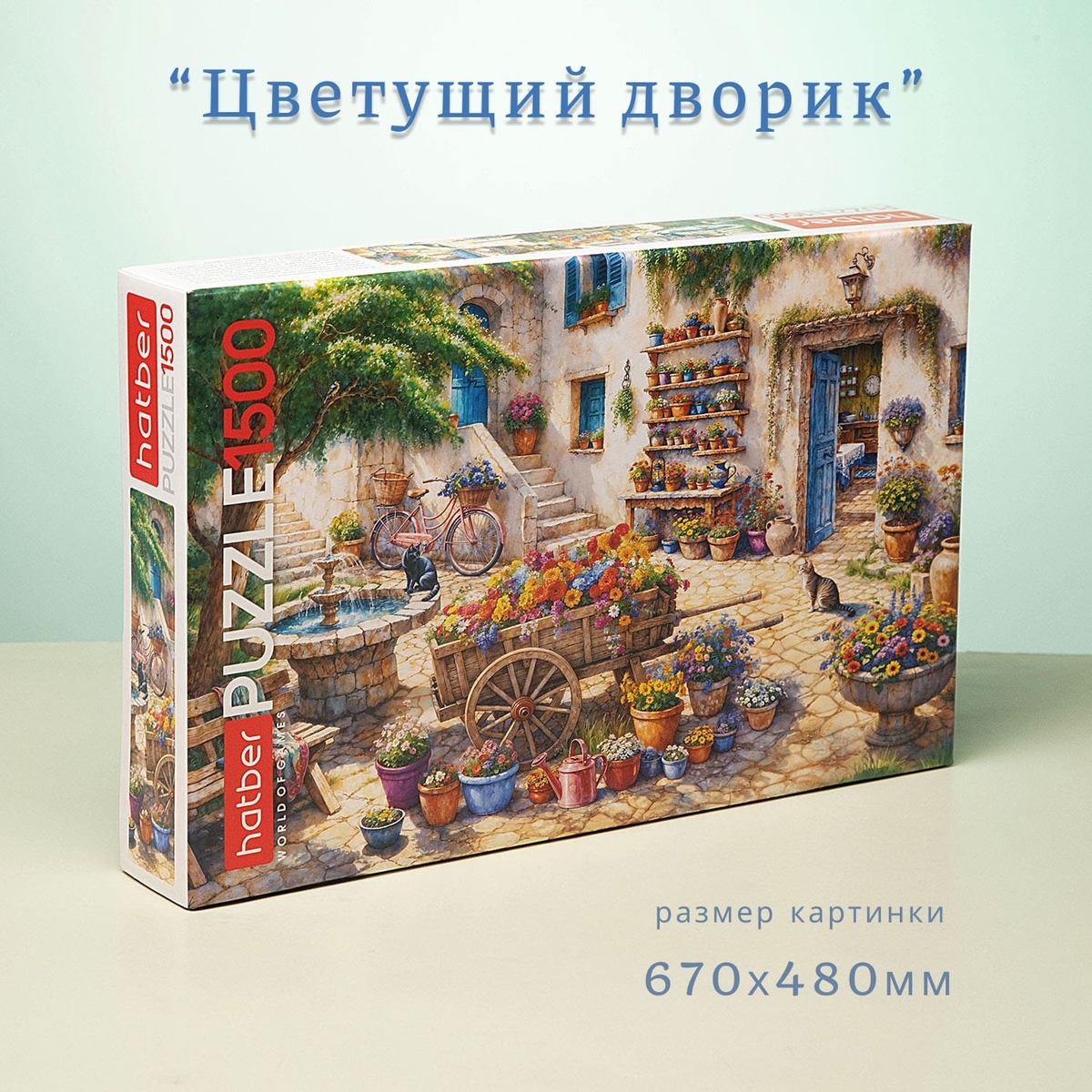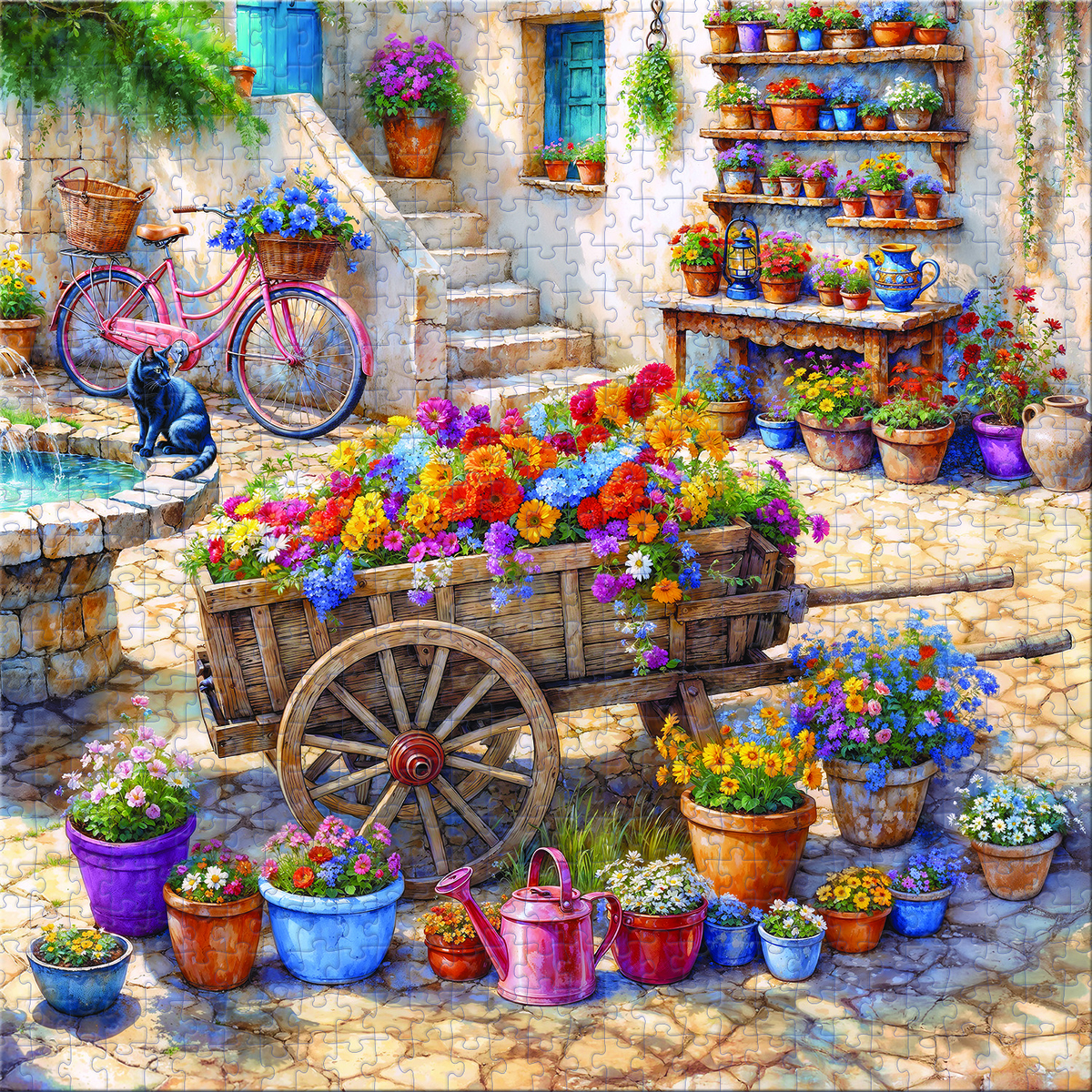 Перед вами самый атмосферный дворик — палитра ярких цветов, старинная тележка с садовыми кашпо, велосипед, ласковое солнце и неспешные пушистые коты. Каждый элемент наполнен светом и теплом, а сборка пазла превращается в медитативное путешествие по миру гармонии и красоты. Подходит для семейного досуга и коллекционеров, которые ценят в пазлах атмосферу уюта и художественную красоту.