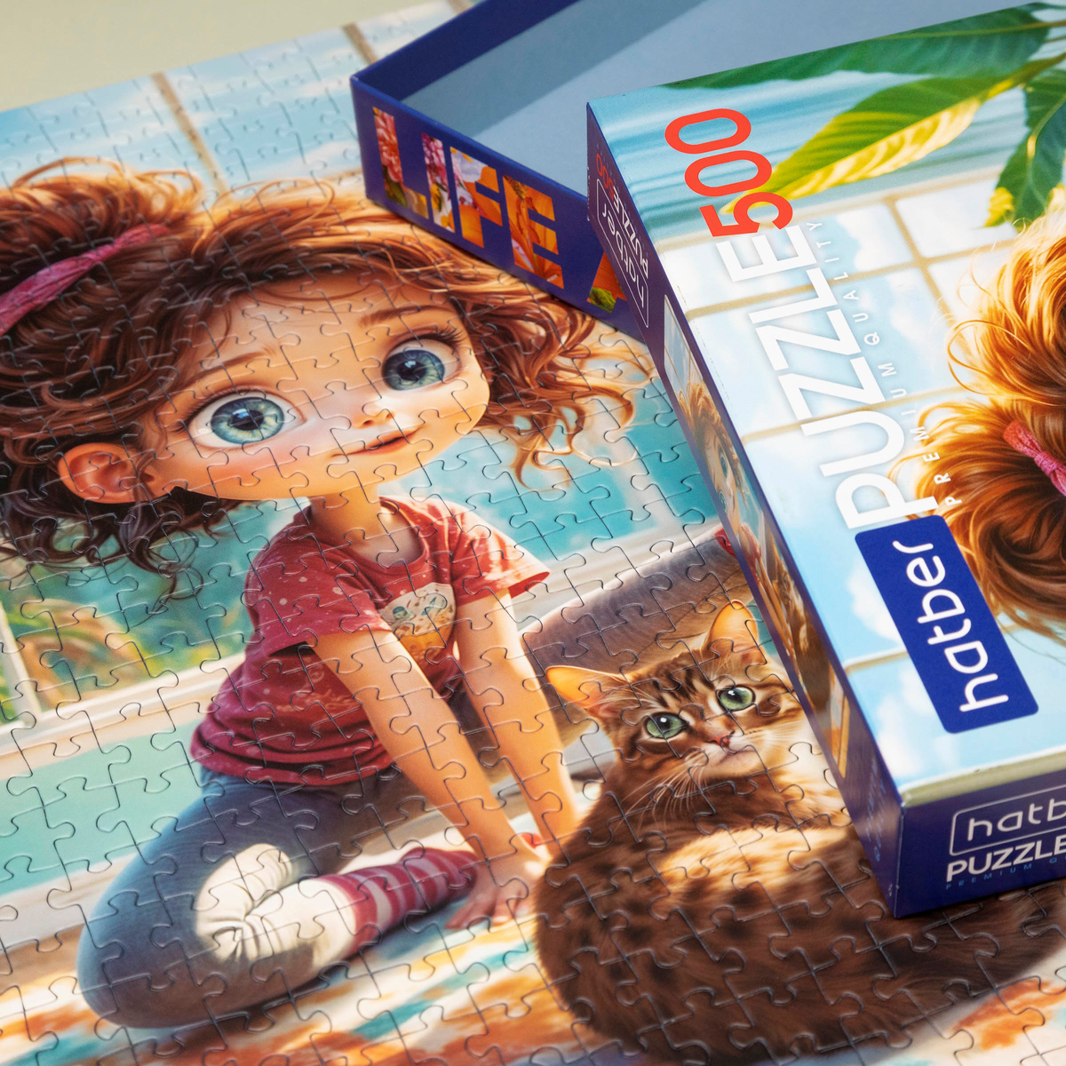 Собирать этот пазл — как делать растяжку для души. Деталь за деталью — и вот уже комната оживает, локоны скачут, а кот будто начинает двигаться. Формат А2 и 500 ярких фрагментов превращают это утро в полноценную тренировку по хорошему настроению.