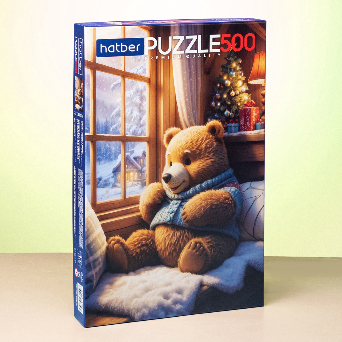 «Уютный мишка» выбрал путь хитрее — не мёрзнет на улице, а расположился на подоконнике с мягкой подушкой. Ёлка украшена, плед пушистый, вид за окном — как из рождественского фильма. Такой пазл собирать — всё равно что перенестись в зимний отпуск, где главное не потревожить хозяина уюта.