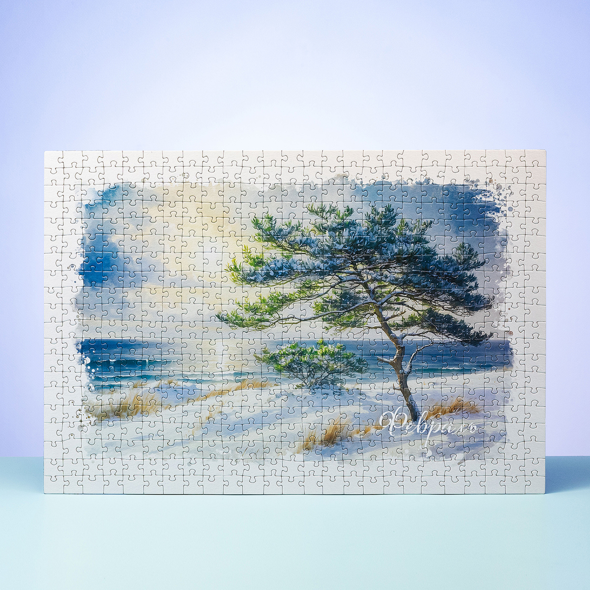 На иллюстрации — прибрежный зимний пейзаж Куршской косы: одинокая сосна на заснеженном берегу и холодное море на горизонте. Акварельная техника, мягкое небо и приглушённые сине‑серые оттенки создают ощущение свежести и тишины. Чёткий силуэт дерева и аккуратные детали травы делают картину выразительной как в рамке, так и в составе общей коллекции. Стандартная рамка серии позволяет снять белый крайний ряд и соединить все 12 месяцев в единое панно на 6000 элементов.