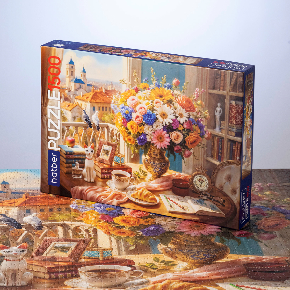 «Солнечное настроение». Кто-то назвал бы это идеальным утром: городская панорама за окном, цветы, книги и неспешный завтрак. Этот пазл — о моментах, когда день начинается с улыбки.