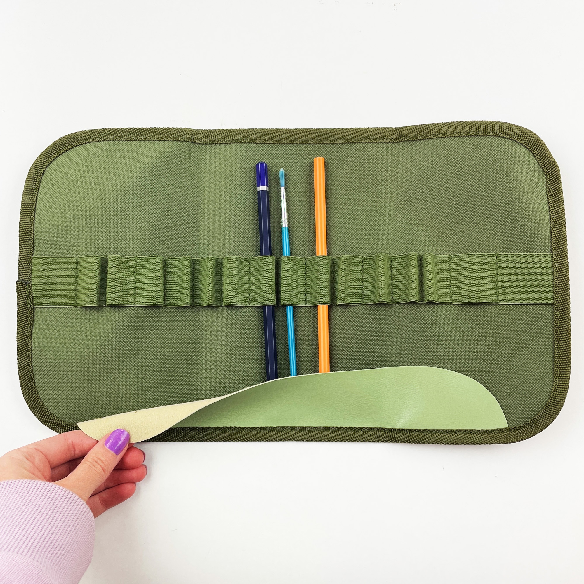 Когда пенал-скрутка свернут, он занимает меньше места, чем обычный пенал, что делает его удобным для переноски в рюкзаке или сумке. Это удобный и практичный аксессуар для переноски и хранения кистей, который станет помощником как начинающих, так и профессиональных художников. Предназначен для 16 предметов.
