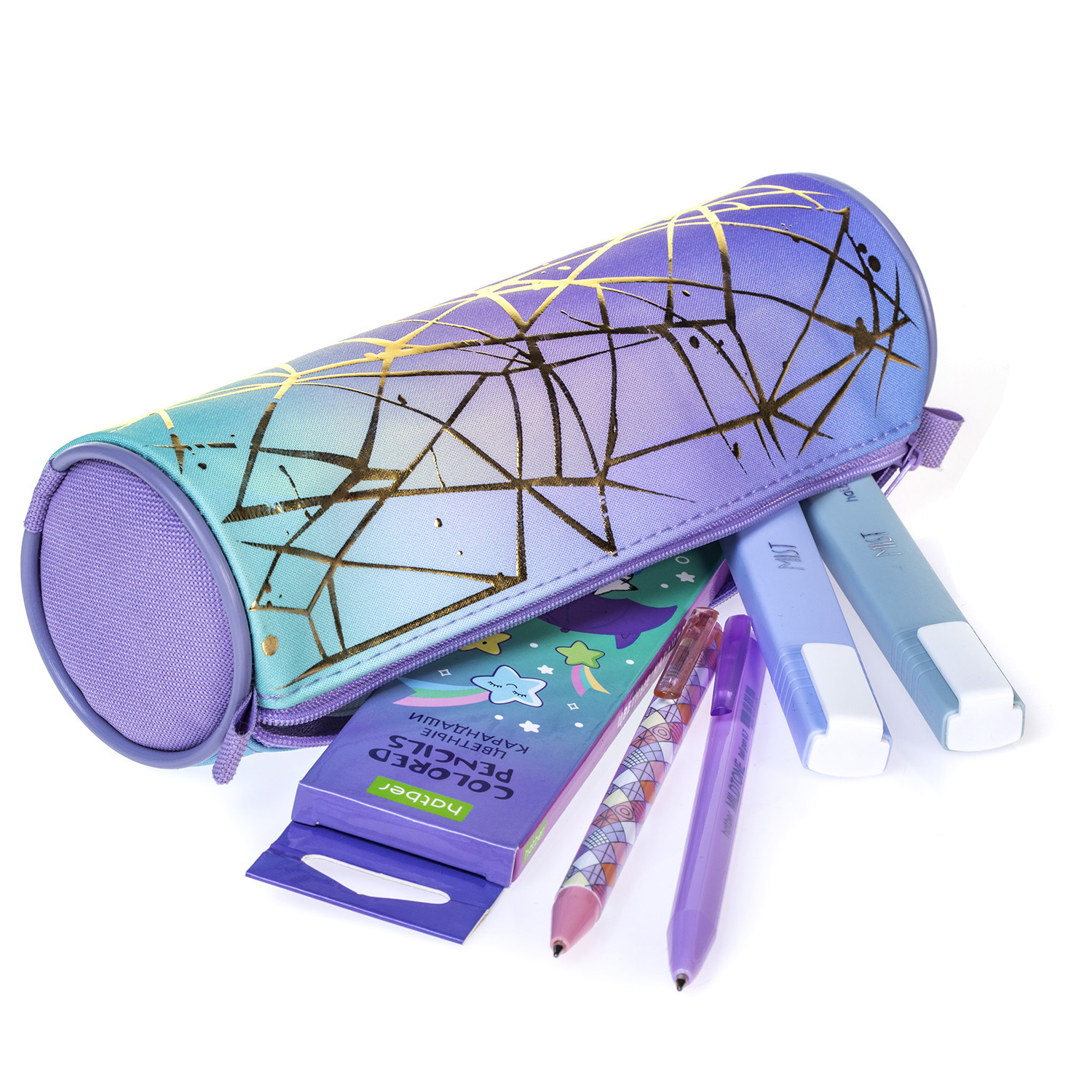 Новый пенал-тубус на молнии «Золотые нити», особенностью которого является отделка 3D-фольгой, добавляющая модный акцент к простому дизайну и придающая некое очарование. Новинка выполнена из прочного высококачественного текстиля, что позволяет ей противостоять воздействию влаги и грязи. Эффектный пенал станет отличным решением для хранения канцелярских принадлежностей и не только.