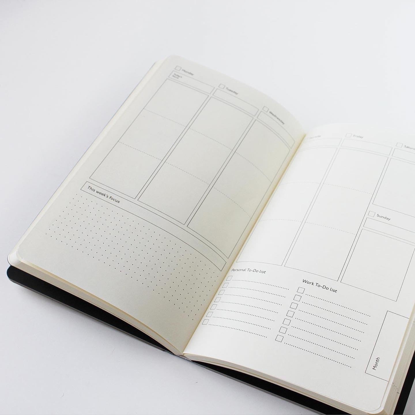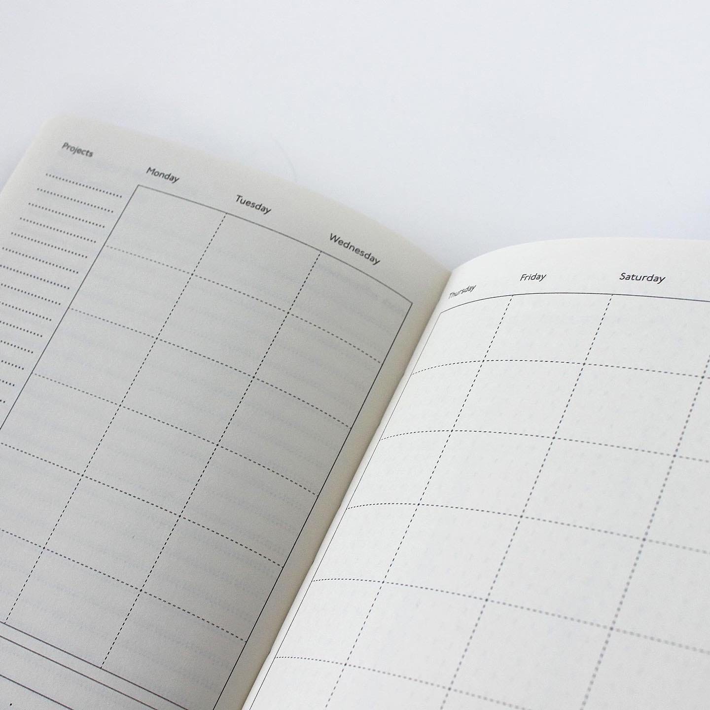 - еженедельный блок. Пространство для организации каждого дня. Расписывайте дела по времени или группируйте тематически;
