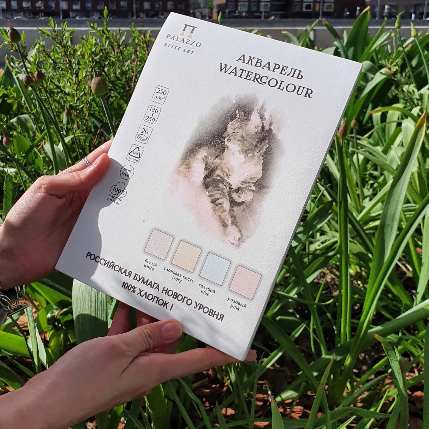 В планшете «Акварельный котик микс» представлены четыре цвета хлопковой бумаги: белый, слоновая кость, розовый и голубой.