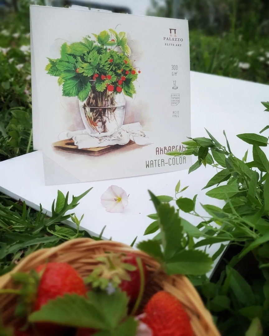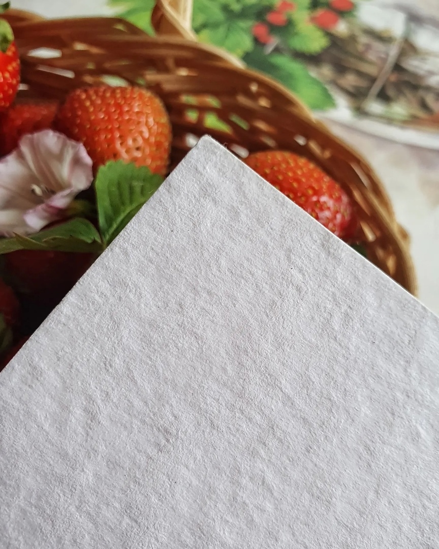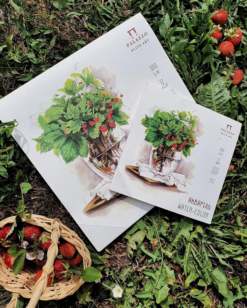 Планшет для акварели «Аромат земляники» имеет внутренний блок из 12 листов белой бумаги с фактурой торшон (облачный). Плотность листов — 300 г/кв. м. Изготовлена бумага из целлюлозы.