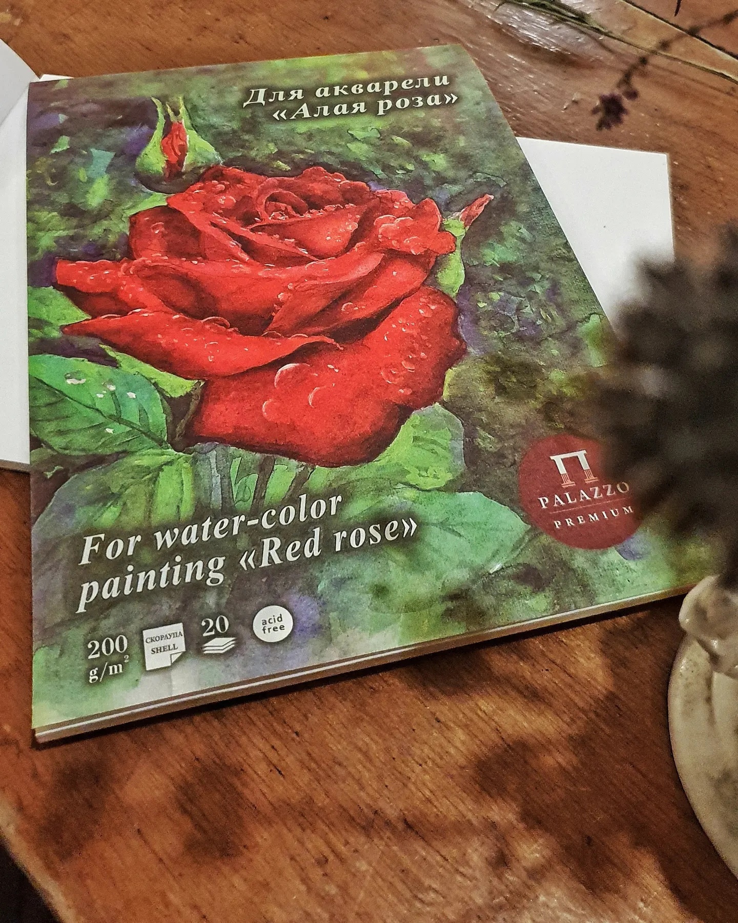 Планшет для акварели с яркой обложкой «Алая роза» включает внутренний блок из 20 листов карточной тисненой бумаги (тиснение «скорлупа») белого цвета и плотностью 200 г/кв. м. C одной стороны бумага тиснёная, с другой — гладкая.