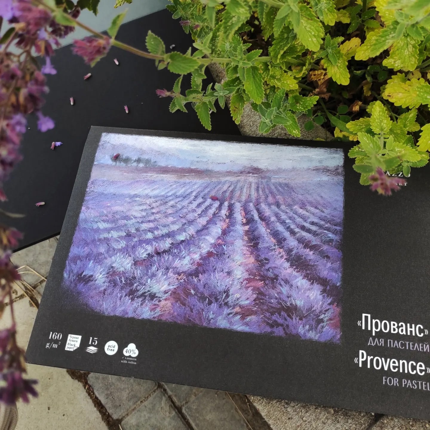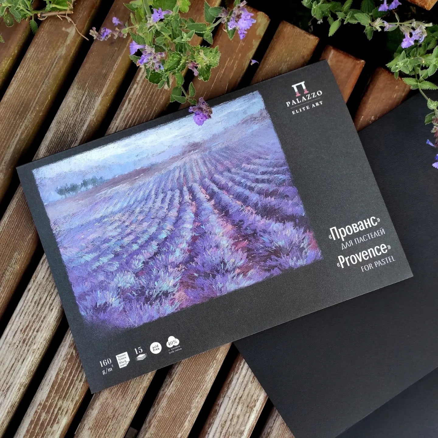 Планшет для пастели «Прованс» с нежными лавандовыми полями на обложке. Внутри 15 листов угольно-чёрного цвета плотностью 160 г/кв. м. Бумага с одной стороны имеет тиснение холст, с другой стороны без тиснения, использовать можно обе.