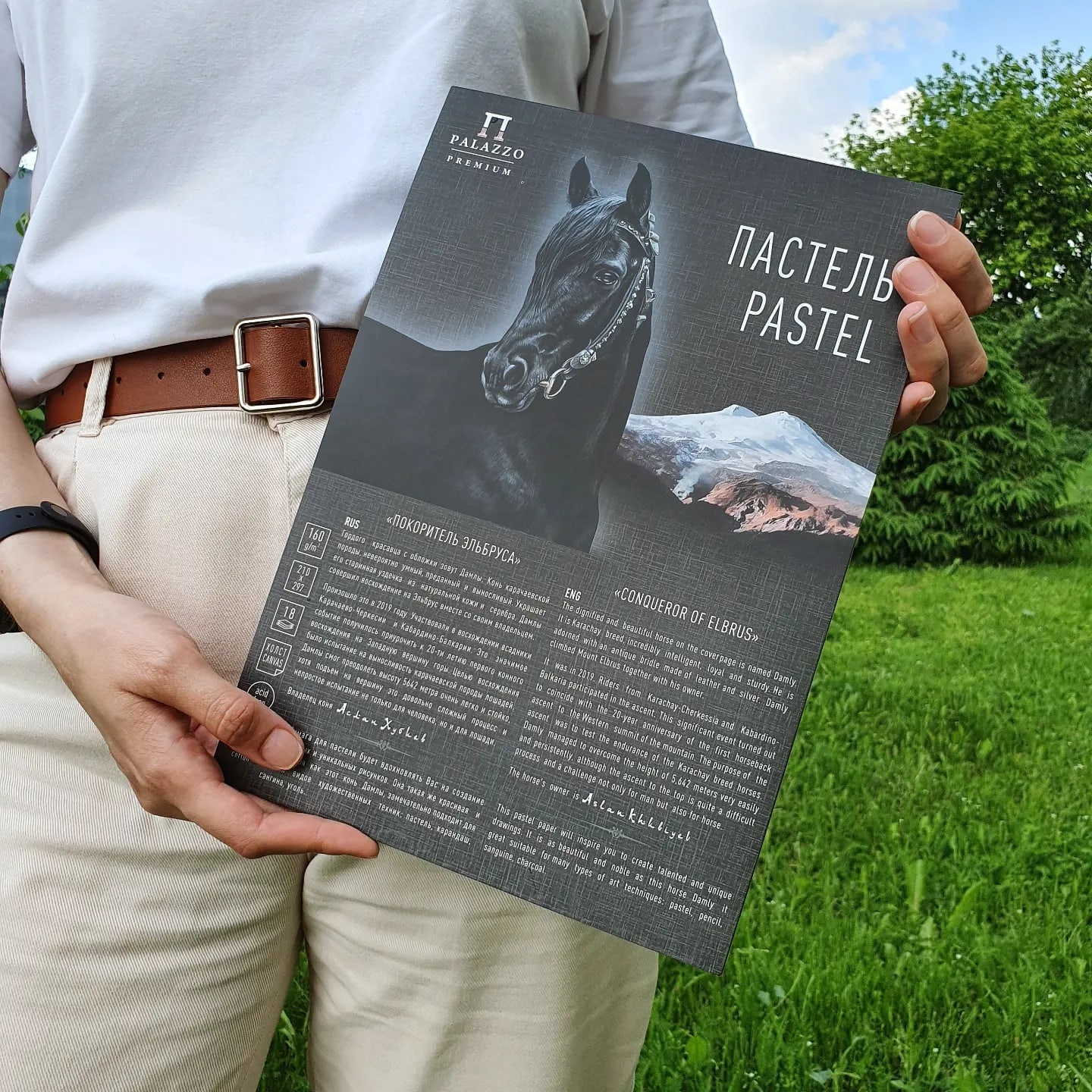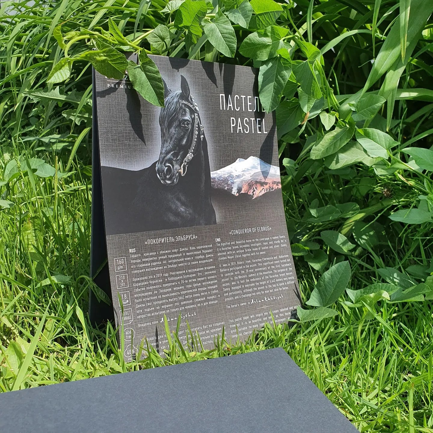 Приятная новость для тех, кто любит использовать в своем творчестве пастельную бумагу Premium. Выпущен новый планшет «Покоритель Эльбруса». На обложке красуется великолепный вороной конь карачаевской породы. Этого красавца зовут Дамлы, совершил он восхождение на одну из вершин горы Эльбрус.