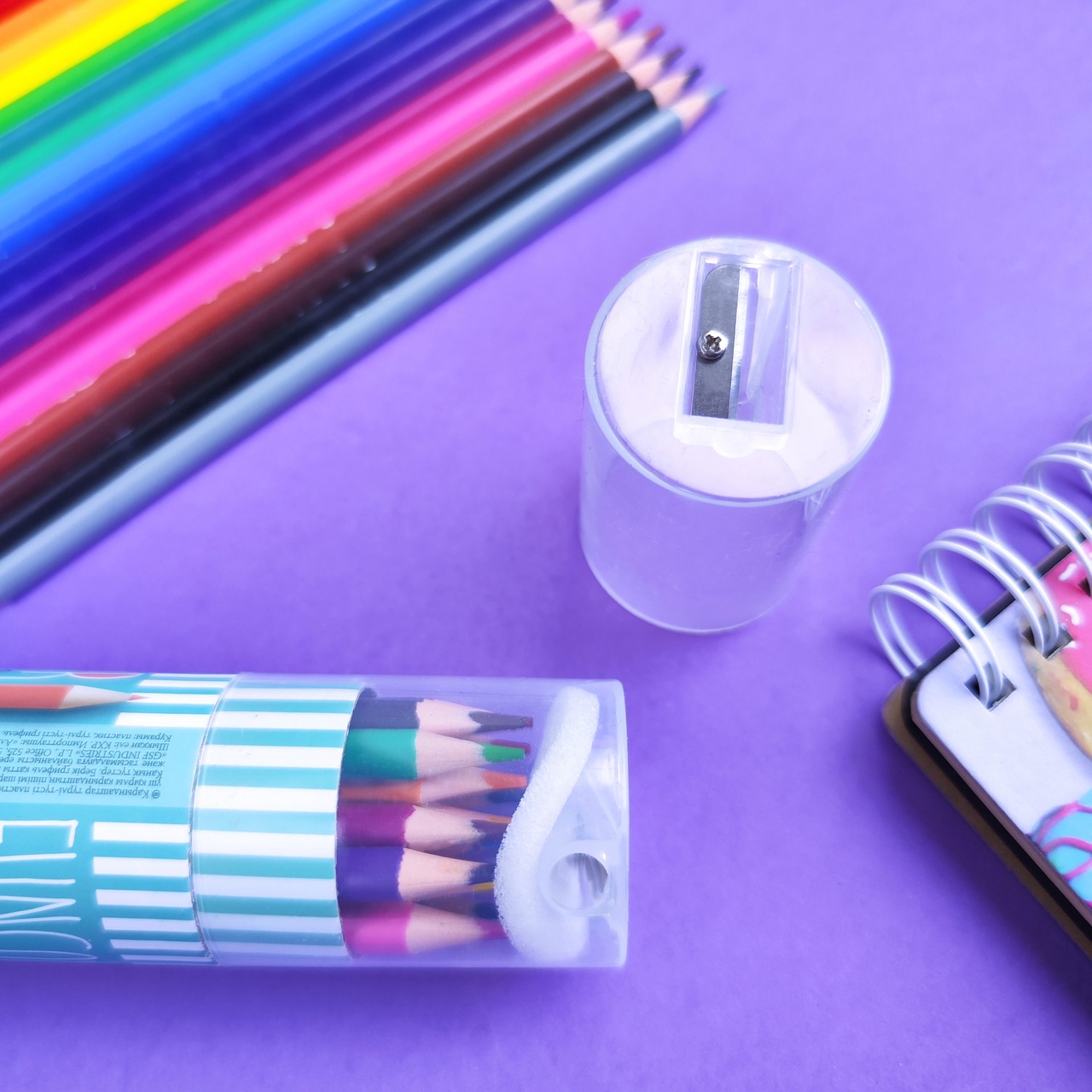 Набор упакован в удобный пенал-тубус с пластиковой прозрачной крышкой. У крышки есть дополнительный функционал — возможность затачивать карандаши благодаря встроенной точилке.