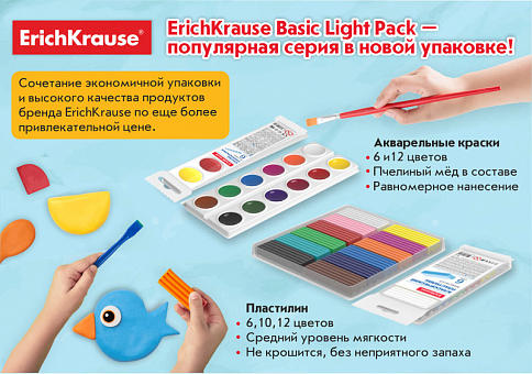 Встречайте серию ErichKrause Basic Light Pack — пластилин и акварельные краски в облегчённой упаковке. Акварель и пластилин поставляются в палетках из белого пластика в прозрачной упаковке, что существенно снижает себестоимость, а значит делает цену на продукцию ещё приятнее.