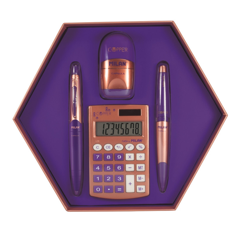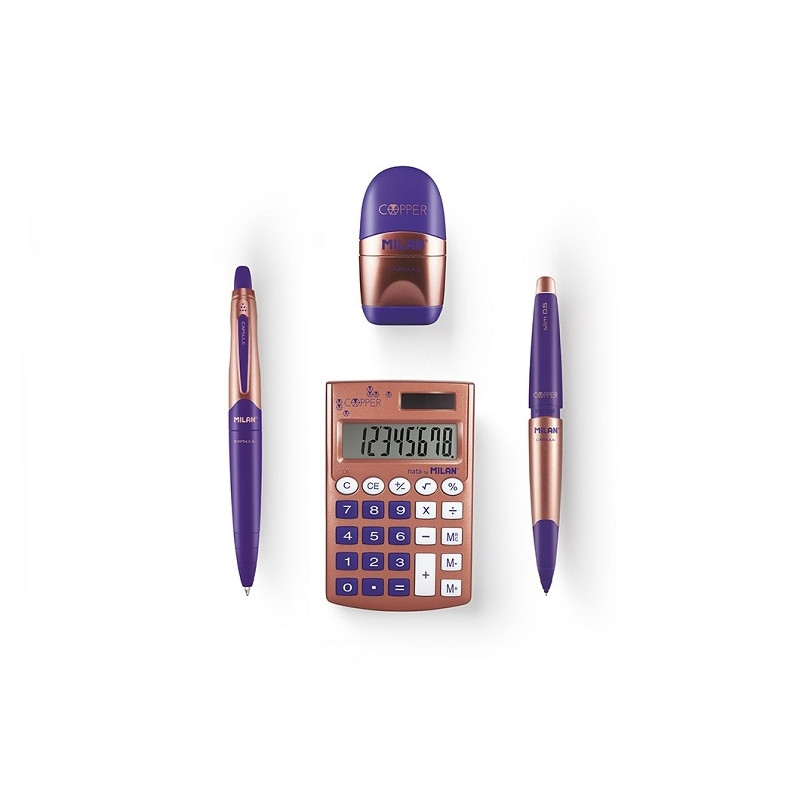 Фиолетовые набор: калькулятор на восемь разрядов с двойной системой питания, ластик-точилка, ластик из синтетического каучука, точилка из пластика, лезвие из углеродистой стали, шариковая ручка, чернила синего цвета (толщина пишущего узла — 1 мм), механический карандаш со стержнем толщиной 0,5 мм.
