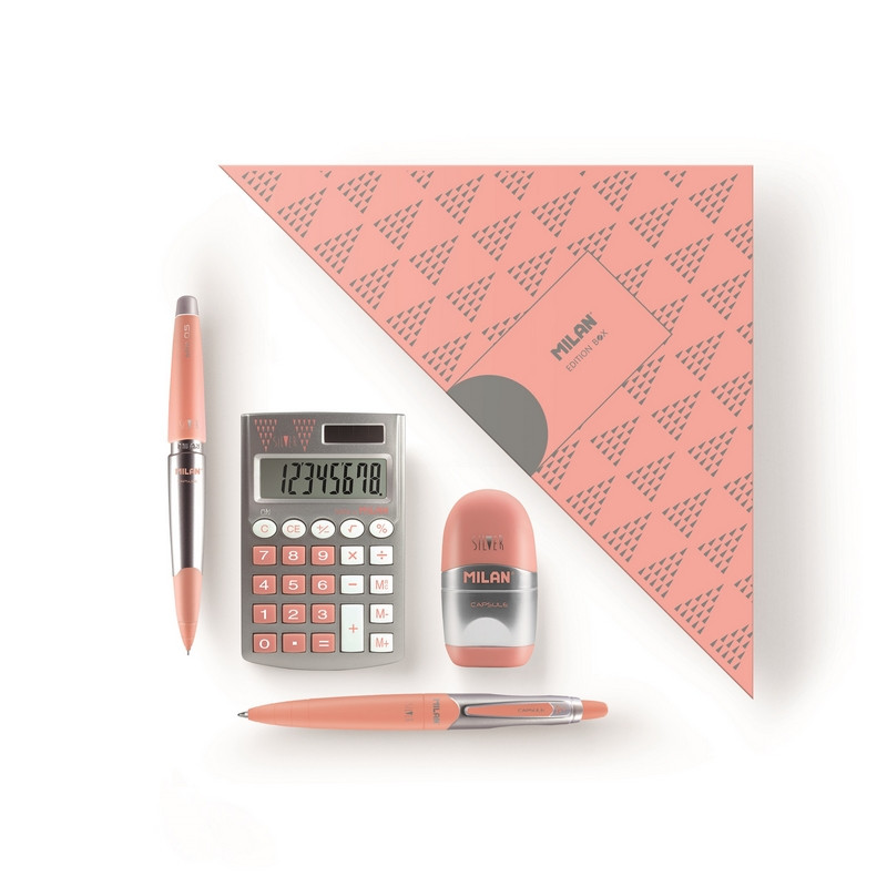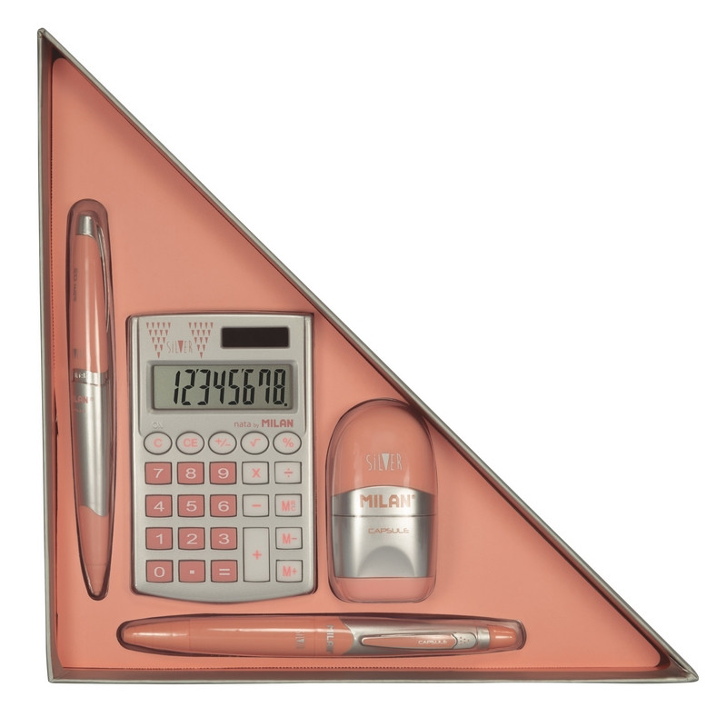 Розовый набор: калькулятор на восемь разрядов с двойной системой питания, ластик из синтетического каучука в пластиковом футляре, шариковая ручка, чернила синего цвета (толщина пишущего узла — 1 мм), механический карандаш со стержнем толщиной 0,5 мм.