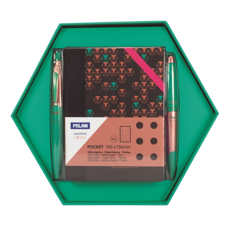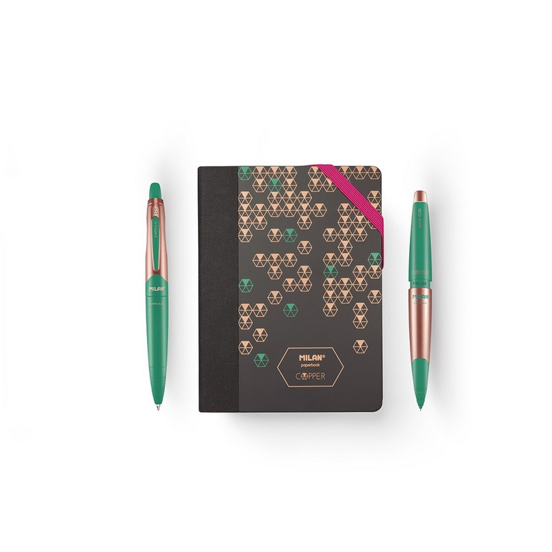 Зелёный набор: записная книжка на 208 страниц (толщина бумаги — 80 г), линовка в точку, с закладкой, резинкой и карманчиком для визиток, шариковая ручка, чернила синего цвета (толщина пишущего узла — 1 мм»), механический карандаш со стержнем толщиной 0,5 мм.