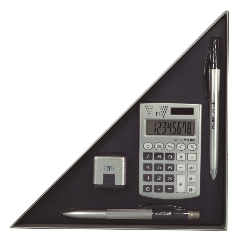 Разноцветный набор: калькулятор на восемь разрядов с двойной системой питания, ластик-точилка, ластик из синтетического каучука, точилка из пластика, лезвие из углеродистой стали, шариковая ручка, чернила синего цвета (толщина пишущего узла — 1 мм), механический карандаш со стержнем толщиной 0,5 мм.