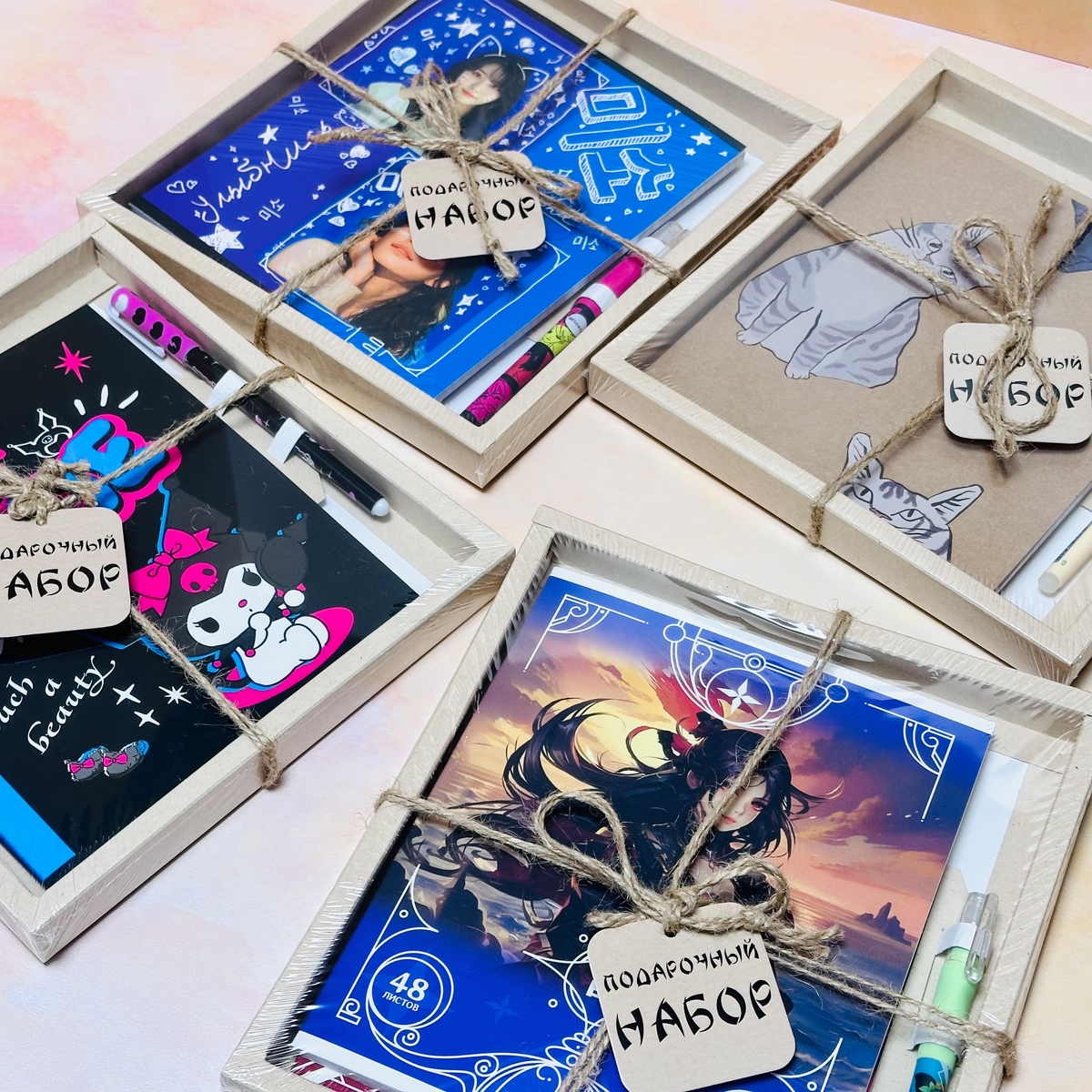 В каждом наборе тетради в объёме 48 листов и ручка.