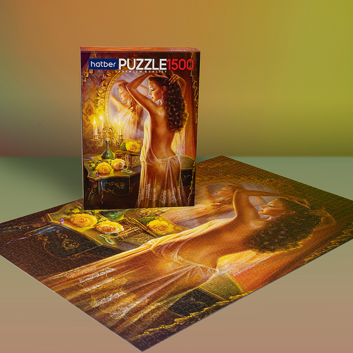 На пазле изображена прекрасная девушка в вечернем туалете, стоящая у зеркала в окружении свечей и цветов. Каждая деталь изображения продумана до мелочей, от ткани платья до блеска украшений. Соберите этот пазл и украсьте им свой дом, добавив нотку изящества и романтики в интерьер.