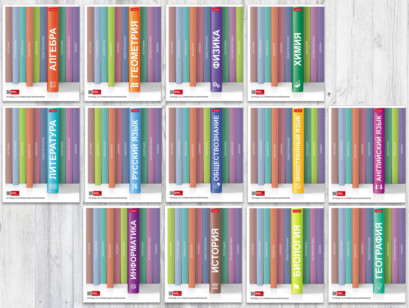 Обложки данной серии выполнены в стиле стоящих в ряд школьных предметов, будто книги на полке в библиотеке. И какую книгу ты выдвинул ближе к себе, такую тетрадь выбрал для изучения соответствующего школьного предмета.