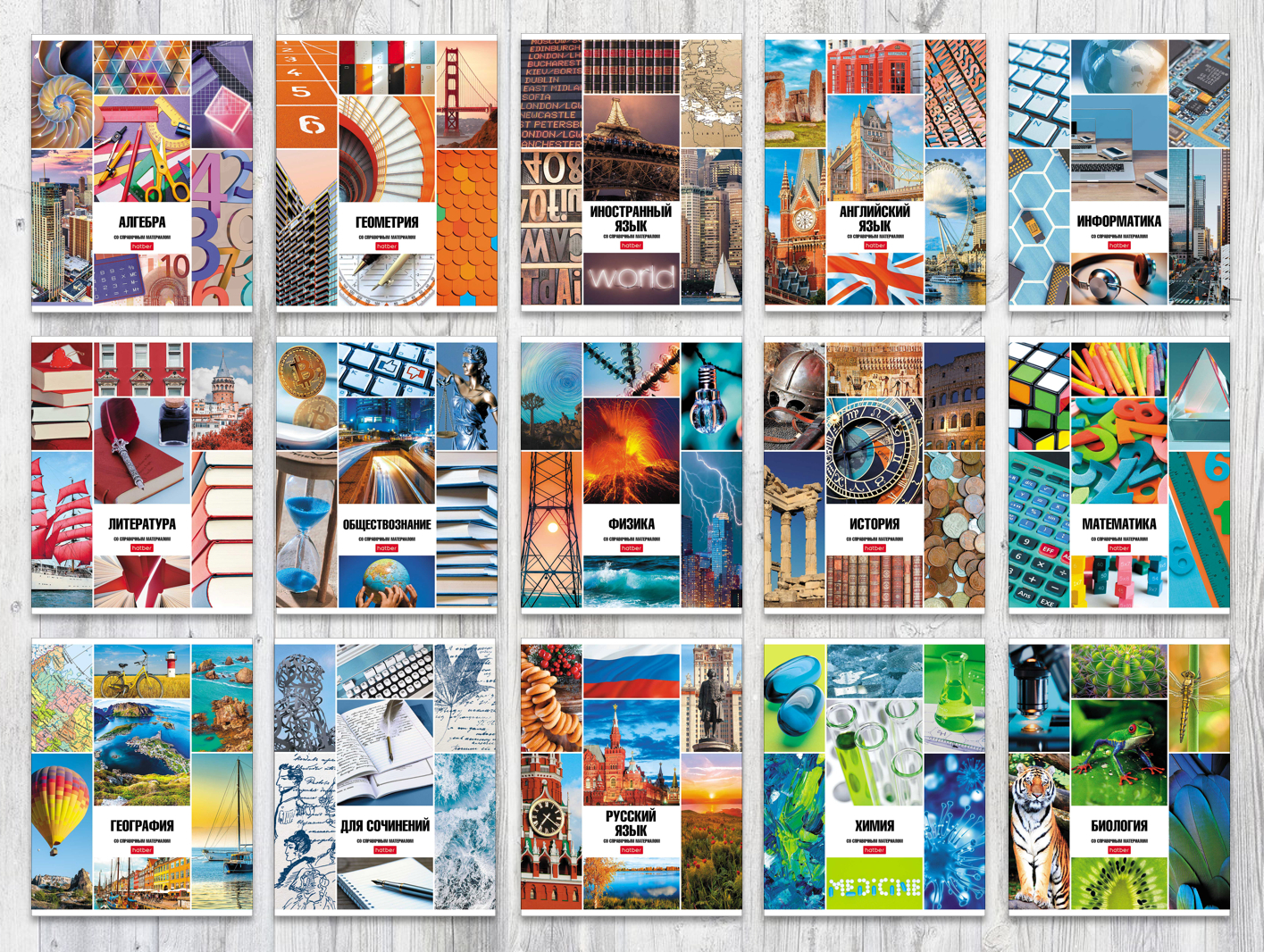 На обложках – эффектные изображения в виде коллажа из «мира» того или иного школьного предмета. Такая сдержанная концепция и яркие акценты на деталях привлекают внимание, настраивая учеников на отличную учебу.