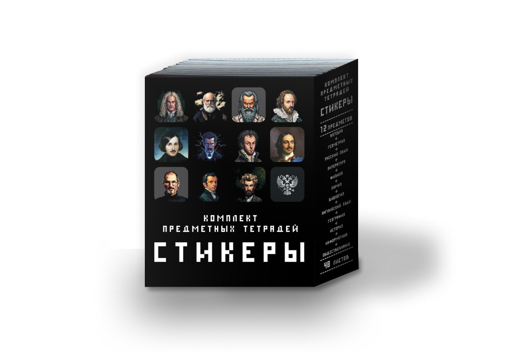 Представляем серию предметных тетрадей «Стикеры». Погрузитесь в мир науки и искусства с коллекцией из 12 строгих чёрных тетрадей, где великие учёные и деятели предстают в виде пиксель-арт стикеров. Идеальный выбор для поклонников стикеров, ретрогейминга, чёрного цвета и минимализма.