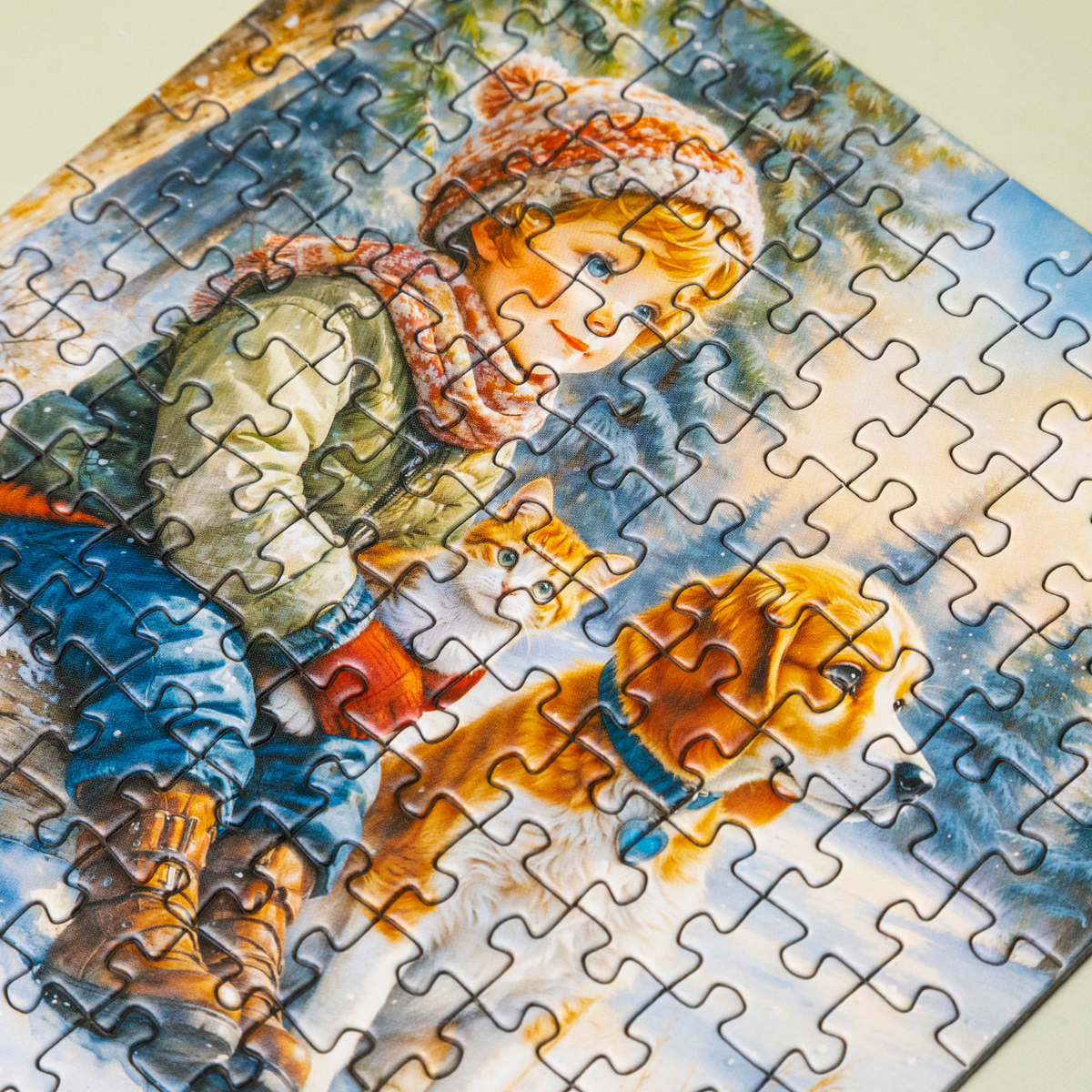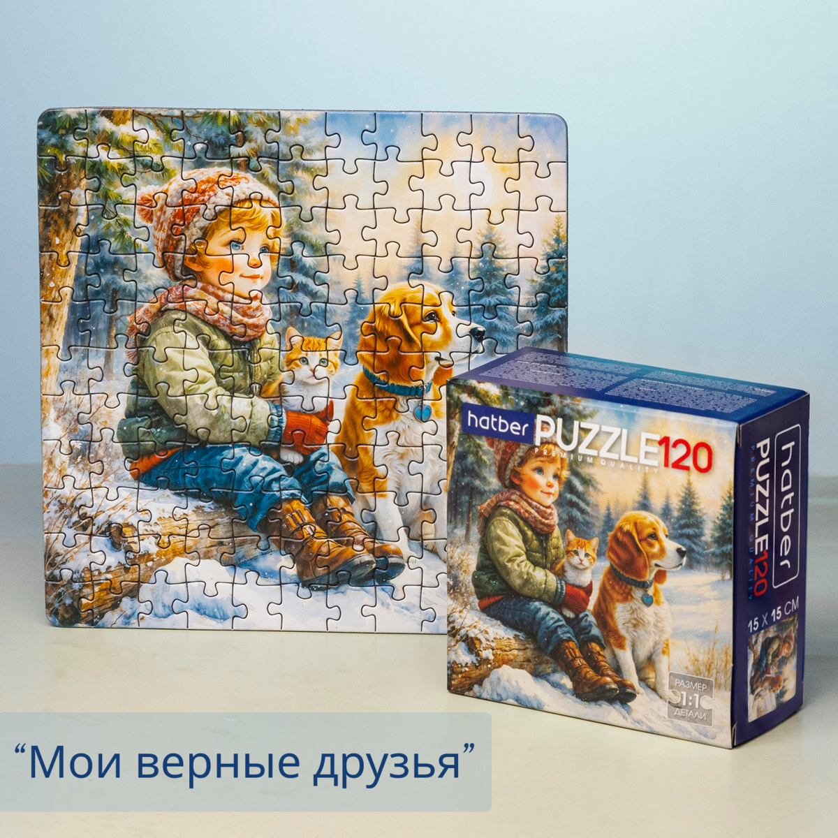 Сюжет «Мои верные друзья» переносит в мир дружбы. Рядом с мальчиком — его пушистые питомцы: верный пёс и уютно устроившийся на руках котёнок, а вся сцена детских зимних прогулок наполнена искренностью и заботой.