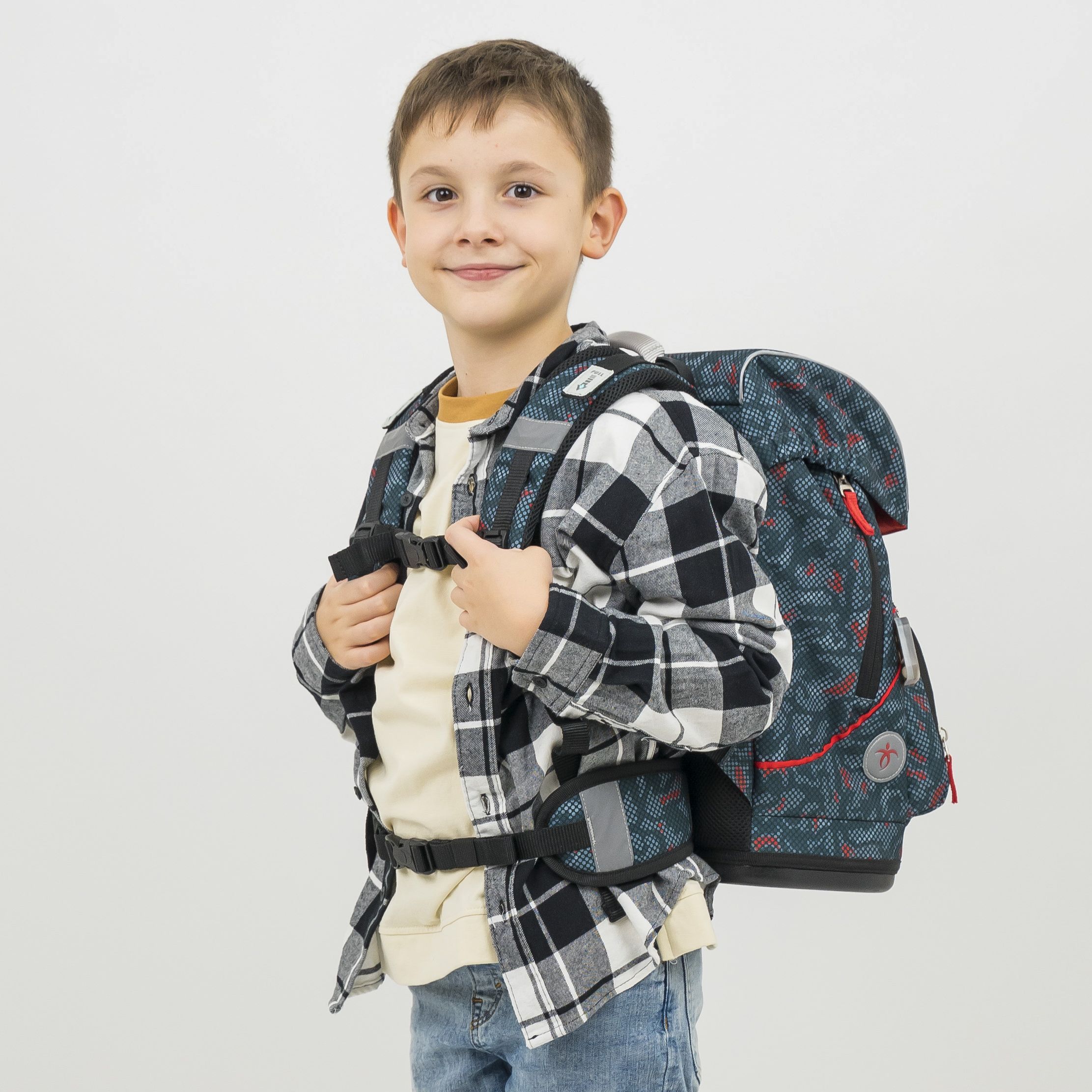 Дно из прочного пластика защищает вещи от грязи и влаги. Вместительные внутренние отделения, термокарман для завтрака на передней части ранца, отдельный карман для пенала. Сменные стикеры позволяют ребёнку самостоятельно выбрать дизайн и менять его по желанию. Магнитный замок со светоотражателем легко откроет и закроет даже первоклассник. Светоотражающие элементы, повышающие безопасность, по всему периметру ранца.